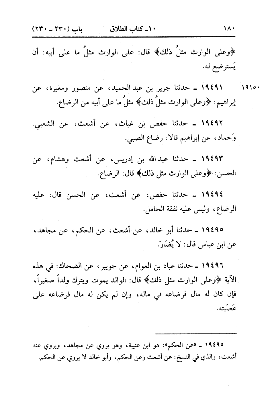 19491- حَدَّثَنَا جَرِيرُ بْنُ عَبْدِ الْحَمِيدِ , عَنْ مَنْصُورٍ ، وَمُغِيرَةَ , عَنْ إبْرَاهِيمَ {وَعَلَى الْوَارِثِ مِثْلُ ذَلِكَ} مثل مَا عَلَى أَبِيهِ مِنَ الرَّضَاعِ.