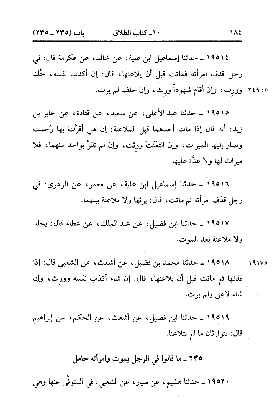 19514- حَدَّثَنَا إسْمَاعِيلُ ابْنُ عُلَيَّةَ , عَنْ خَالِدٍ , عَنْ عِكْرِمَةَ قَالَ فِي رَجُلٍ قَذَفَ امْرَأَتَهُ فَمَاتَتْ قَبْلَ أَنْ يُلاَعِنَهَا قَالَ : إِنْ أكْذَبَ نَفْسَهُ جُلِدَ وَوَرِثَ , وَإِنْ أَقَامَ شُهُودًا وَرِثَ , وَإِنْ حَلَفَ لَمْ يَرِثْ. (5/248).