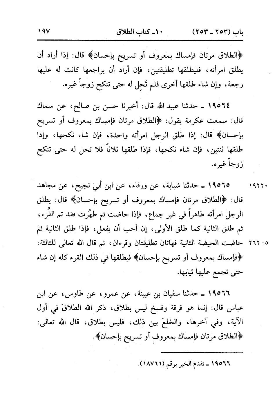 19565- حَدَّثَنَا شَبَابَةُ , عَنْ وَرْقَاءَ ، عَنِ ابْنِ أَبِي نَجِيحٍ , عَنْ مُجَاهِدٍ : {الطَّلاَقُ مَرَّتَانِ فَإِمْسَاكٌ بِمَعْرُوفٍ أَوْ تَسْرِيحٌ بِإِحْسَانٍ} قَالَ : يُطَلِّقُ الرَّجُلُ امْرَأَتَهُ طَاهِرًا مِنْ غَيْرِ جِمَاعٍ ، فَإِذَا حَاضَتْ , ثُمَّ طَهُرَتْ فَقَدْ تَمَّ الْقُرْءُ , ثُمَّ طَلَّقَ الثَّانِيَةَ كَمَا طَلَّقَ الأُولَى إِنْ أَحَبَّ أَنْ يَفْعَلَ , فَإِذَا طَلَّقَ الثَّانِيَةَ , ثُمَّ حَاضَتِ الْحَيْضَةَ الثَّانِيَةَ , فَهَاتَانِ تَطْلِيقَتَانِ وَقُرْءَانِ , ثُمَّ قَالَ اللَّهُ تَعَالَى لِلثَّالِثَةِ : {فَإِمْسَاكٌ بِمَعْرُوفٍ أَوْ تَسْرِيحٌ بِإِحْسَانٍ} فَيُطَلِّقُهَا فِي ذَلِكَ الْقُرْءِ كُلِّهِ إِنْ شَاءَ حِينَ تَجْمَعُ عَلَيْهَا ثِيَابَهَا. (5/261).