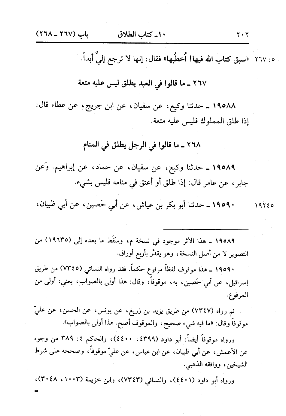 19589- حَدَّثَنَا وَكِيعٌ , عَنْ سُفْيَانَ , عَنْ حَمَّادٍ , عَنْ إبْرَاهِيمَ , وَعَنْ جَابِرٍ , عَنْ عَامِرٍ قَالَ : إذَا طَلَّقَ ، أَوْ أَعْتَقَ فِي مَنَامِهِ فَلَيْسَ بِشَيْءٍ. (5/267).
