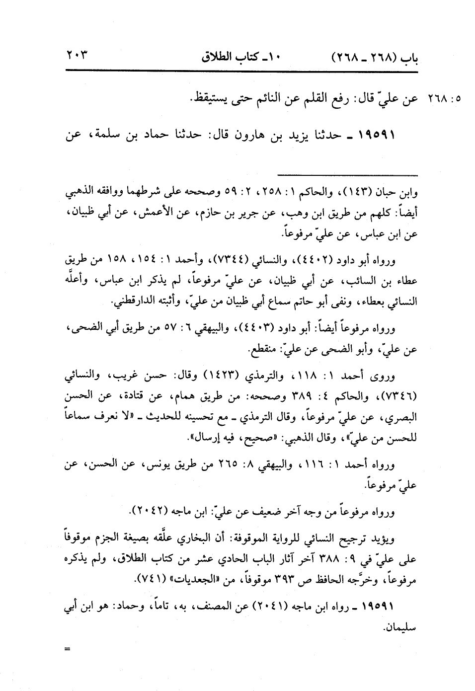19591- حَدَّثَنَا يَزِيدُ بْنُ هَارُونَ , قَالَ : حدَّثَنَا حَمَّادُ بْنُ سَلَمَةَ , عَنْ حَمَّادٍ , عَنْ إبْرَاهِيمَ ، عَنِ الأَسْوَدِ , عَنْ عَائِشَةَ ، عَنِ النَّبِيِّ صَلَّى الله عَلَيْهِ وَسَلَّمَ قَالَ : رُفِعَ الْقَلَمُ , عَنْ ثَلاَثَةٍ , عَنِ النَّائِمِ حَتَّى يَسْتَيْقِظَ. (5/268).