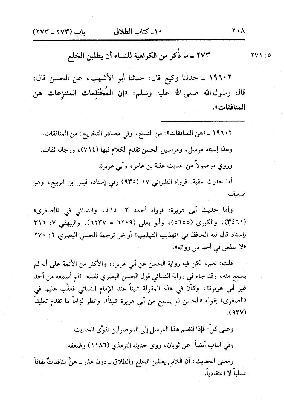 19602- حَدَّثَنَا وَكِيعٌ , قَالَ : حدَّثَنَا أَبُو الأَشْهَبِ ، عَنِ الْحَسَنِ ، قَالَ : قَالَ رَسُولُ اللهِ صَلَّى الله عَلَيْهِ وَسَلَّمَ : إنَّ الْمُخْتَلِعَاتِ الْمُنْتَزِعَاتِ هُنَّ الْمُنَافِقَاتُ. (5/271).