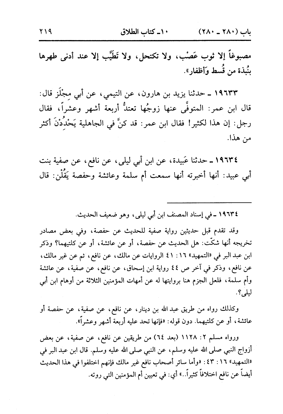 19634- حَدَّثَنَا عَبِيْدَةُ ، عَنِ ابْنِ أَبِي لَيْلَى , عَنْ نَافِعٍ , عَنْ صَفِيَّةَ بِنْتِ أَبِي عُبَيْدٍ أَنَّهَا أَخْبَرَتْهُ أَنَّهَا سَمِعَتْ أُمَّ سَلَمَةَ وَعَائِشَةَ وَحَفْصَةَ يَقُلْنَ قَالَ رَسُولُ اللهِ صَلَّى الله عَلَيْهِ وَسَلَّمَ : لاَ يَحِلُّ لاِمْرَأَةٍ تُؤْمِنُ بِاللَّهِ وَالْيَوْمِ الآخِرِ تَحُدُّ عَلَى مَيِّتٍ فَوْقَ ثَلاَثَةِ أَيَّامٍ إلاَّ عَلَى بَعْلِهَا فَإِنَّهَا تَحِدُّ عَلَيْهِ أَرْبَعَةَ أَشْهُرٍ وَعَشْرًا. (5/281).