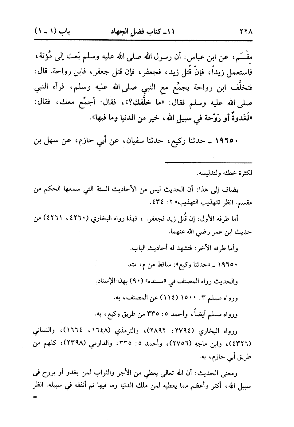 19650- حَدَّثَنَا وَكِيعٌ ، حَدَّثَنَا سُفْيَانُ ، عَنْ أَبِي حَازِمٍ ، عَنْ سَهْلِ بْنِ سَعْدٍ ، قَالَ : قَالَ رَسُولُ اللهِ صَلَّى الله عَلَيْهِ وَسَلَّمَ : لَغَدْوَةٌ ، أَوْ رَوْحَةٌ فِي سَبِيلِ اللهِ خَيْرٌ مِنَ الدُّنْيَا وَمَا فِيهَا. (5/284).