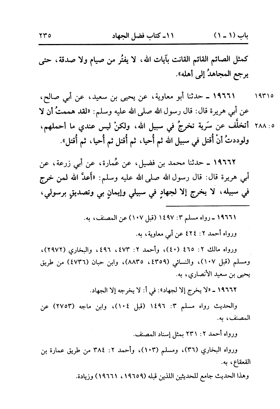 19661- حَدَّثَنَا أَبُو مُعَاوِيَةَ ، عَنْ يَحْيَى بْنِ سَعِيدٍ ، عَنْ أَبِي صَالِحٍ ، عَنْ أَبِي هُرَيْرَةَ ، قَالَ : قَالَ رَسُولُ اللهِ صَلَّى الله عَلَيْهِ وَسَلَّمَ : لَقَدْ هَمَمْت أَنْ لاَ أَتَخَلَّفَ عَنْ سَرِيَّةٍ تَخْرُجُ فِي سَبِيلِ اللهِ , وَلَكِنْ لَيْسَ عِنْدِي مَا أَحْمِلُهُمْ , وَلَوَدِدْت أن أُقْتَلُ فِي سَبِيلِ اللهِ ، ثُمَّ أَحْيَا ، ثُمَّ أُقْتَلُ ، ثُمَّ أَحْيَا ، ثُمَّ أُقْتَلُ. (5/287).