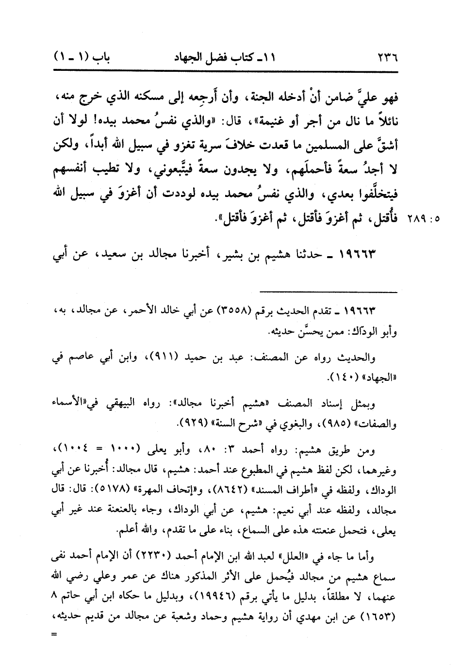 19662- حَدَّثَنَا مُحَمَّدُ بْنُ فُضَيْلٍ ، عَنْ عُمَارَةَ ، عَنْ أَبِي زُرْعَةَ ، عَنْ أَبِي هُرَيْرَةَ ، قَالَ : قَالَ رَسُولُ اللهِ صَلَّى الله عَلَيْهِ وَسَلَّمَ : أَعَدَّ اللَّهُ لِمَنْ خَرَجَ فِي سَبِيلِهِ لاَ يَخْرُجُ إِلاَّ لِجِهَادٍ فِي سَبِيلِي , وَإِيمَانٍ بِي وَتَصْدِيقٍ بِرُسُلِي , فَهُوَ عَلَيَّ ضَامِنٌ أَنْ أُدْخِلَهُ الْجَنَّةَ , وَأَنْ أَرْجِعَهُ إلَى مَسْكَنِهِ الَّذِي خَرَجَ مِنْهُ نَائِلاً مَا نَالَ مِنْ أَجْرٍ ، أَوْ غَنِيمَةٍ ، قَالَ : وَالَّذِي نَفْسُ مُحَمَّدٍ بِيَدِهِ ، لَوْلاَ أَنْ أَشُقَّ عَلَى الْمُسْلِمِينَ مَا قَعَدْتُ خِلاَفَ سَرِيَّةٍ تَغْزُو فِي سَبِيلِ اللهِ أَبَدًا , وَلَكِنْ لاَ أَجِدُ سَعَةً فَأَحْمِلَهُمْ ، وَلاَ يَجِدُونَ سَعَةً فَيَتْبَعُونِي ، وَلاَ تَطِيبُ أَنْفُسُهُمْ فَيَتَخَلَّفُوا بَعْدِي ، وَالَّذِي نَفْسُ مُحَمَّدٍ بِيَدِهِ لَوَدِدْت أَنْ أَغْزُوَ فِي سَبِيلِ اللهِ فَأُقْتَلَ ، ثُمَّ أَغْزُوَ فَأُقْتَلَ ، ثُمَّ أَغْزُوَ فَأُقْتَلَ. (5/288).
