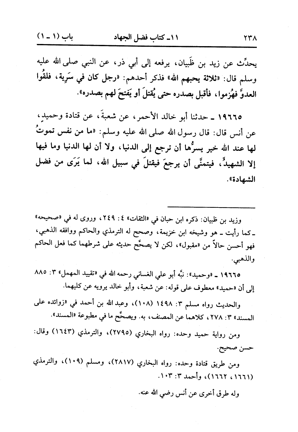 19665- حَدَّثَنَا أَبُو خَالِدٍ الأَحْمَرِِ ، عَنْ شُعْبَةَ ، عَنْ قَتَادَةَ وَحُمَيْدٍ ، عَنْ أَنَسٍ ، قَالَ : قَالَ رَسُولُ اللهِ صَلَّى الله عَلَيْهِ وَسَلَّمَ : مَا مِنْ نَفْسٍ تَمُوتُ لَهَا عِنْدَ اللهِ خَيْرٌ يَسُرُّهَا أَنْ تَرْجِعَ إلَى الدُّنْيَا ، وَلاَ أَنَّ لَهَا الدُّنْيَا وَمَا فِيهَا , إِلاَّ الشَّهِيدَ فَيَتَمَنَّى أَنْ يَرْجِعَ فَيُقْتَلَ فِي سَبِيلِ اللهِ , لِمَا يَرَى مِنْ فَضْلِ الشَّهَادَةِ. (5/289).