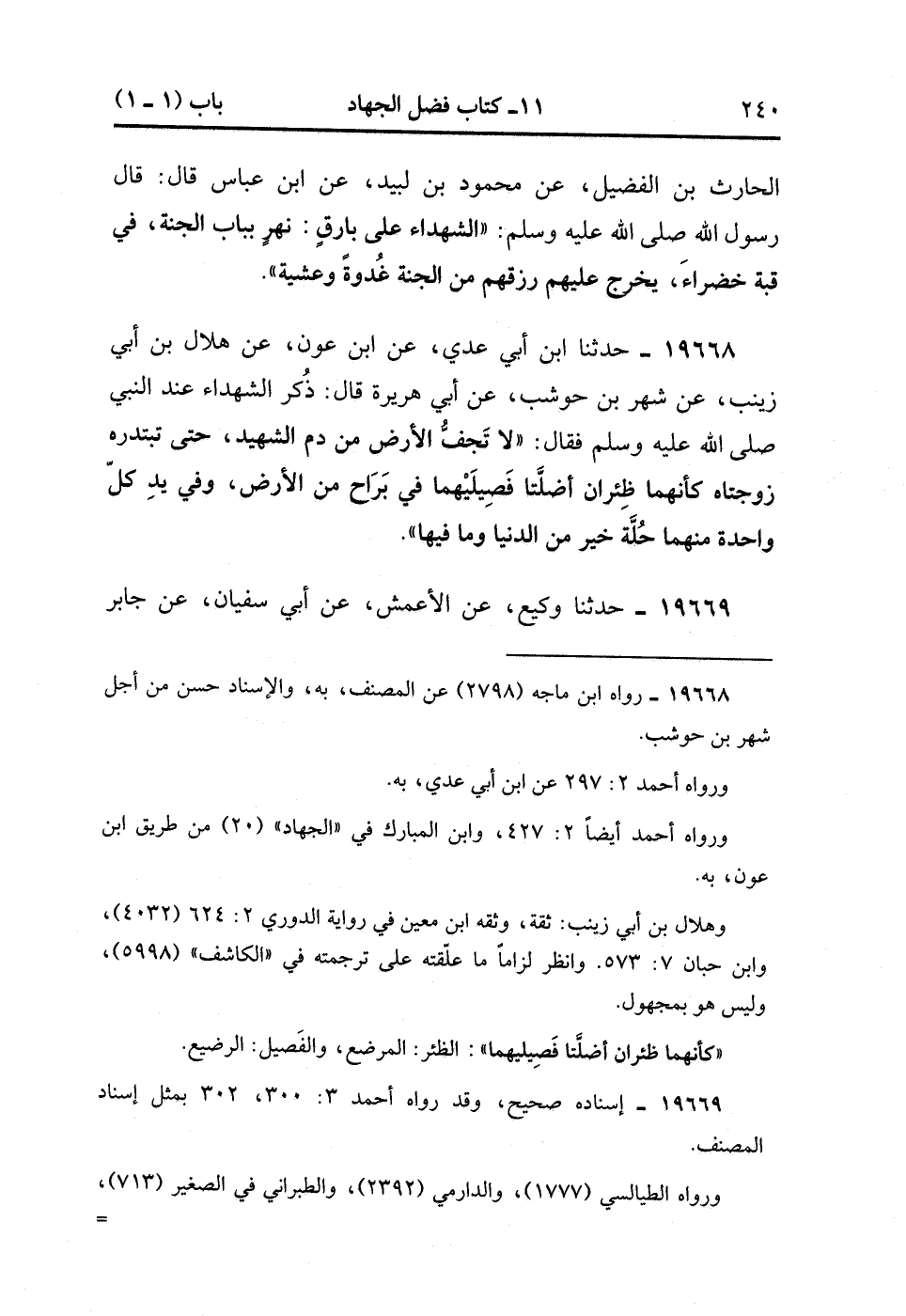 19669- حَدَّثَنَا وَكِيعٌ ، عَنِ الأَعْمَشِ ، عَنْ أَبِي سُفْيَانَ ، عَنْ جَابِرٍ ، قَالُوا : يَا رَسُولَ اللهِ ، أَيُّ الْجِهَادِ أَفْضَلُ ؟ قَالَ : مَنْ عُقِرَ جَوَادُهُ وَأُهَرِيقَ دَمُهُ. (5/290).