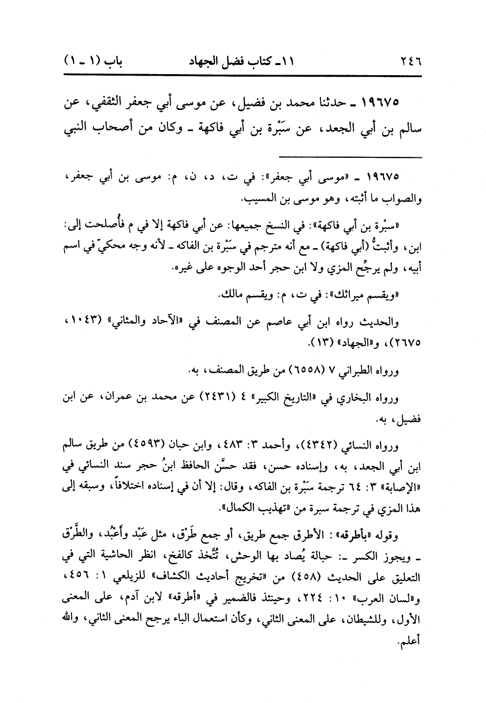 19675- حَدَّثَنَا مُحَمَّدُ بْنُ فُضَيْلٍ ، عَنْ مُوسَى أَبِي جَعْفَرٍ الثَّقَفِيِّ ، عَنْ سَالِمِ بْنِ أَبِي الْجَعْدِ ، عَنْ سَبْرَةَ بْنِ أَبِي فَاكِهٍ وَكَانَ مِنْ أَصْحَابِ النَّبِيِّ صَلَّى الله عَلَيه وسَلَّم ، قَالَ : سَمِعْتُ رَسُولَ صَلَّى الله عَلَيه وسَلَّم يَقُولُ : إنَّ الشَّيْطَانَ قَعَدَ لاِبْنِ آدَمَ بِأَطْرُقِهِ فَقَعَدَ لَهُ بِطَرِيقِ الإِسْلاَمِ ، فَقَالَ : تُسْلِمُ وَتَدَعُ دِينَك وَدِينَ آبَائِكَ ؟ , ثُمَّ قَعَدَ لَهُ بِطَرِيقِ الْهِجْرَةِ ، فَقَالَ : تُهَاجِرُ , وَتَدَعُ مَوْلِدَك فَتَكُونُ كَالْفَرَسِ فِي طِوَلِهِ , ثُمَّ قَعَدَ لَهُ بِطَرِيقِ الْجِهَادِ ، فَقَالَ : تُجَاهِدُ ، فَتُقْتَلُ ، فَتَتَزَوَّجُ امْرَأَتُكَ ، وَيُقْسَمُ ميراثك ؟ قَالَ : فَقَالَ رَسُولُ اللهِ صَلَّى الله عَلَيه وسَلَّم : فَمَنْ فَعَلَ ذَلِكَ ضَمِنَ اللَّهُ لَهُ الْجَنَّةَ إِنْ قُتِلَ ، أَوْ مَاتَ غَرَقًا ، أَوْ حَرْقًا ، أَوْ أَكَلَهُ السَّبُعُ.