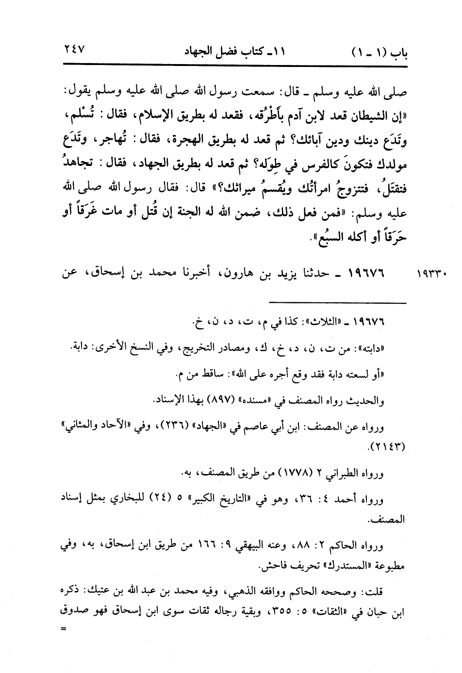19676- حَدَّثَنَا يَزِيدُ بْنُ هَارُونَ ، أَخْبَرَنَا مُحَمَّدُ بْنُ إِسْحَاقَ ، عَنْ مُحَمَّدِ بْنِ إِبْرَاهِيمَ ، عَنْ مُحَمَّدِ بْنِ عَبْدِ اللهِ بْنِ عَتِيكٍ ، عَنْ أَبِيهِ ، قَالَ : سَمِعْتُ رَسُولَ اللهِ صَلَّى الله عَلَيْهِ وَسَلَّمَ يَقُولُ : مَنْ خَرَجَ مُجَاهِدًا فِي سَبِيلِ اللهِ ، ثُمَّ جَمَعَ أَصَابِعَهُ الثَّلاَثَةَ ، ثُمَّ قَالَ : وَأَيْنَ الْمُجَاهِدُونَ , فَخَرَّ عَنْ دَابَّتِهِ وَمَاتَ , فَقَدْ وَقَعَ أَجْرُهُ عَلَى اللهِ ، أَوْ لَسَعَتْهُ دَابَّةٌ فَقَدْ وَقَعَ أَجْرُهُ عَلَى اللهِ , وَمَنْ مَاتَ حَتْفَ أَنْفِهِ , فَقَدْ وَقَعَ أَجْرُهُ عَلَى اللهِ , وَمَنْ قُتِلَ قَعْصًا فَقَدَ اسْتَوْجَبَ الْمَآبَ. (5/293).
