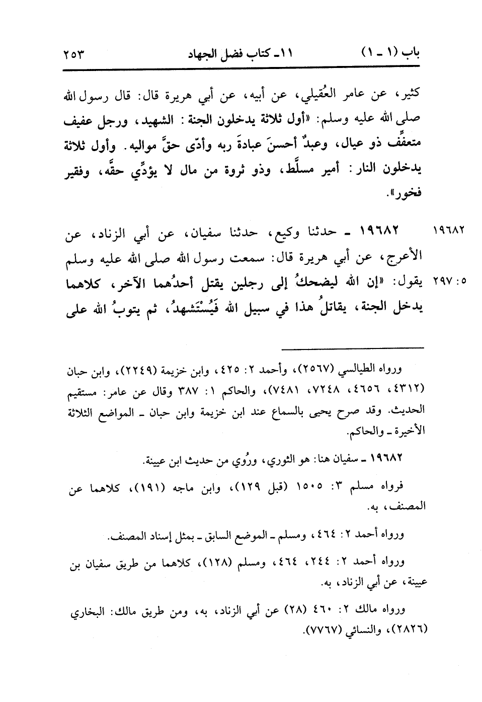 19682- حَدَّثَنَا وَكِيعٌ ، عَنْ أَبِي الزِّنَادِ ، عَنِ الأَعْرَجِ ، عَنْ أَبِي هُرَيْرَةَ ، قَالَ : سَمِعْتُ رَسُولَ اللهِ صَلَّى الله عَلَيْهِ وَسَلَّمَ يَقُولُ : إنَّ اللَّهَ لَيَضْحَكُ إلَى رَجُلَيْنِ يَقْتُلُ أَحَدُهُمَا الآخَرَ , كِلاَهُمَا يَدْخُلُ الْجَنَّةَ ، يُقَاتِلُ هَذَا فِي سَبِيلِ اللهِ فَيُسْتَشْهَدُ ، ثُمَّ يَتُوبُ اللَّهُ عَلَى قَاتِلِهِ فَيُسْلِمُ , فَيُقَاتِلُ فِي سَبِيلِ اللهِ فَيُسْتَشْهَدُ. (5/296).