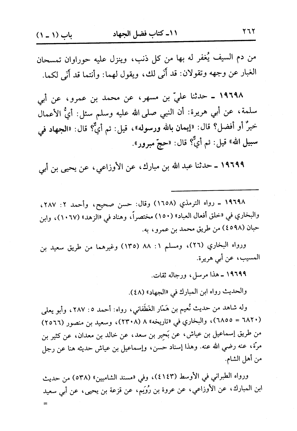 19698- حَدَّثَنَا عَلِيُّ بْنُ مُسْهِرٍ ، عَنْ مُحَمَّدِ بْنِ عَمْرٍو ، عَنْ أَبِي سَلَمَةَ ، عَنْ أَبِي هُرَيْرَةَ ، أن النَّبِيِّ صَلَّى الله عَلَيْهِ وَسَلَّمَ سُئِلَ : أَيُّ الأَعْمَالِ خَيْرٌ ، أَوْ أَفْضَلُ ؟ قَالَ : إيمَانٌ بِاللَّهِ وَرَسُولِهِ ، قِيلَ : ثُمَّ أَيُّ ؟ قَالَ : الْجِهَادُ فِي سَبِيلِ اللهِ ، قِيلَ : ثُمَّ أَيُّ ؟ قَالَ : حَجٌّ مَبْرُورٌ.