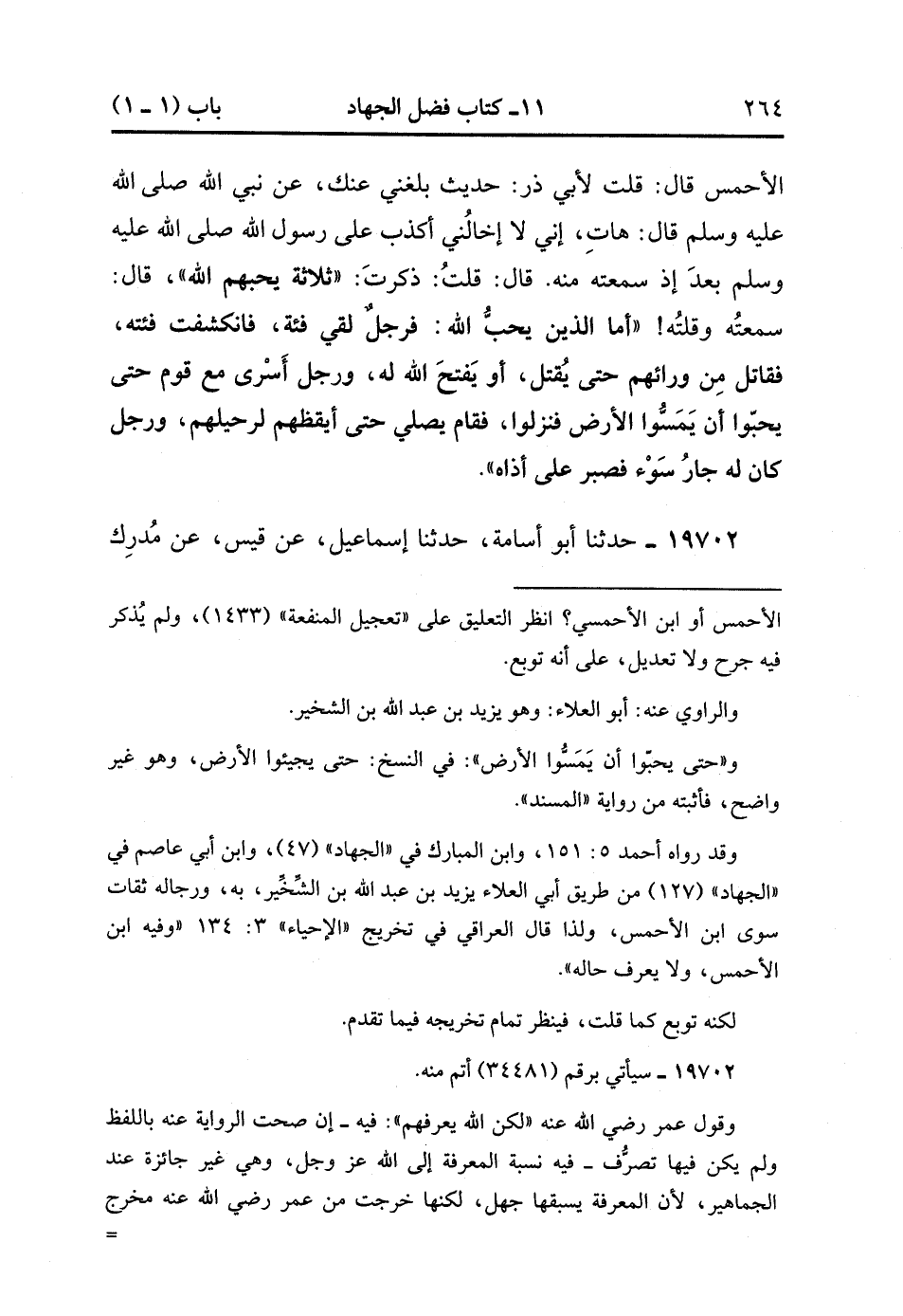 19702- حَدَّثَنَا أَبُو أُسَامَةَ ، حَدَّثَنَا إسْمَاعِيلُ ، عَنْ قَيْسٍ ، عَنْ مُدْرِكِ بْنِ عَوْفٍ الأَحْمَسِيِّ ، قَالَ : كُنْتُ عِنْدَ عُمَرَ إذْ جَاءَهُ رَسُولُ النُّعْمَانِ بْنِ مُقَرِّنٍ فَسَأَلَهُ عُمَرُ عَنِ النَّاسِ ، فَقَالَ : أُصِيبَ فُلاَنٌ وَفُلاَنٌ وَآخَرُونَ لاَ أَعْرِفُهُمْ ، فَقَالَ عُمَرُ : لَكِنَّ اللَّهَ يَعْرِفُهُمْ ، فَقَالَ : يَا أَمِيرَ الْمُؤْمِنِينَ وَرَجُلٌ شَرَى نَفْسَهُ ، فَقَالَ مُدْرِكُ بْنُ عَوْفٍ : ذَلِكَ وَاللَّهِ خَالِي يَا أَمِيرَ الْمُؤْمِنِينَ ، زَعَمَ النَّاسُ أَنَّهُ أَلْقَى بِيَدِهِ إلَى التَّهْلُكَةِ ، فَقَالَ عُمَرُ : كَذَبَ أُولَئِكَ وَلَكِنَّهُ مِمَّنَ اشْتَرَى الآخِرَةَ بِالدُّنْيَا. (5/303).