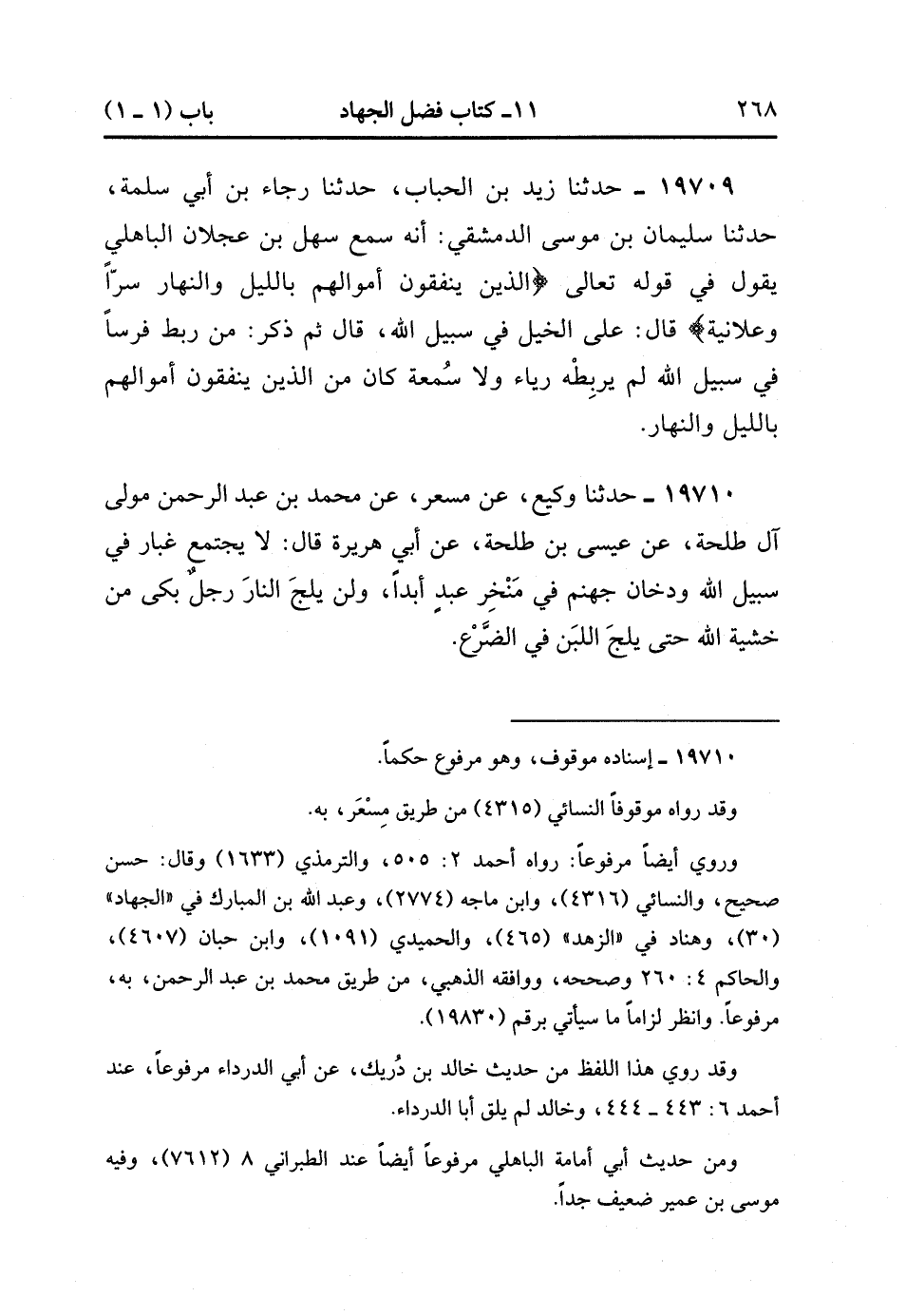 19709- حَدَّثَنَا زَيْدُ بْنُ الْحُبَابِ ، حَدَّثَنَا رَجَاءُ بْنُ أَبِي سَلَمَةَ ، حَدَّثَنَا سُلَيْمَانُ بْنُ مُوسَى الدِّمَشْقِيُّ , أَنَّهُ سَمِعَ سَهْلَ بْنِ عَجْلاَنَ الْبَاهِلِيَّ يَقُولُ فِي قَوْلِهِ تَعَالَى : {الَّذِينَ يُنْفِقُونَ أَمْوَالَهُمْ بِاللَّيْلِ وَالنَّهَارِ سِرًّا وَعَلاَنِيَةً} قَالَ : عَلَى الْخَيْلِ فِي سَبِيلِ اللهِ ، قَالَ : ثُمَّ ذَكَرَ مَنْ رَبَطَ فَرَسًا فِي سَبِيلِ اللهِ لَمْ يَرْبِطْه رِيَاءً ، وَلاَ سُمْعَةً كَانَ مِنَ الَّذِينَ يُنْفِقُونَ أَمْوَالَهُمْ بِاللَّيْلِ وَالنَّهَارِ.