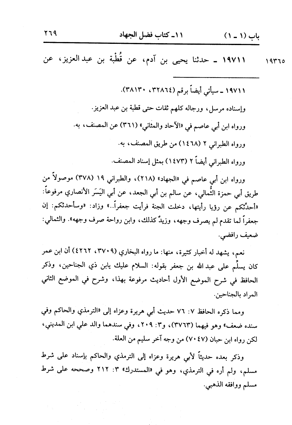 19711- حَدَّثَنَا يَحْيَى بْنُ آدَمَ ، عَنْ قُطْبَةَ بْنِ عَبْدِ الْعَزِيزِ ، عَنِ الأَعْمَشِ ، عَنْ عَدِيِّ بْنِ ثَابِتٍ ، عَنْ سَالِمِ بْنِ أَبِي الْجَعْدِ ، قَالَ : أُرِيهِمُ النَّبِيُّ صَلَّى الله عَلَيْهِ وَسَلَّمَ فِي النَّوْمِ , فَرَأَى جَعْفَرًا مَلَكًا ذَا جَنَاحَيْنِ , مُضَرَّجًا بِالدِّمَاءِ , وَزَيْدًا مُقَابِلُهُ عَلَى السَّرِيرِ ، وَابْنَ رَوَاحَةَ جَالِسٌ مَعَهُمْ , كَأَنَّهُمَا مُعْرِضَانِ عَنْهُ. (5/304).
