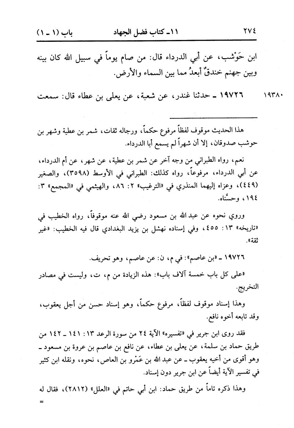19725- حَدَّثَنَا وَكِيعٌ ، حَدَّثَنَا قَيْسُ ، عَنْ شَمِرِ بْنِ عَطِيَّةَ ، عَنْ شَهْرِ بْنِ حَوْشَبَ ، عَنْ أَبِي الدَّرْدَاءِ ، قَالَ : مَنْ صَامَ يَوْمًا فِي سَبِيلِ اللهِ كَانَ بَيْنَهُ وَبَيْنَ جَهَنَّمَ خَنْدَقٌ أَبْعَدُ مِمَّا بَيْنَ السَّمَاءِ وَالأَرْضِ.