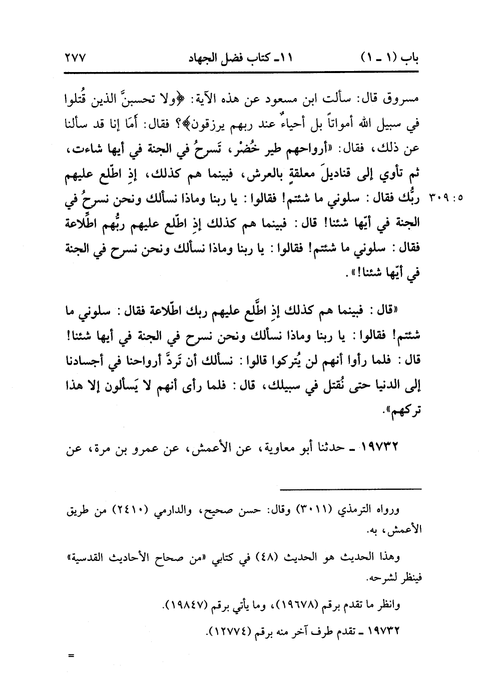 19731- حَدَّثَنَا أَبُو مُعَاوِيَةَ ، عَنِ الأَعْمَشِ ، عَنْ عَبْدِ اللهِ بْنِ مُرَّةَ ، عَنْ مَسْرُوقٍ ، قَالَ : سَأَلْتُ ابْنَ مَسْعُودٍ ، عَنْ هَذِهِ الآيَةِ : {وَلاَ تَحْسَبَنَّ الَّذِينَ قُتِلُوا فِي سَبِيلِ اللهِ أَمْوَاتًا بَلْ أَحْيَاءٌ عِنْدَ رَبِّهِمْ يُرْزَقُونَ} ، فَقَالَ : أَمَا إنَّا قَدْ سَأَلْنَا عَنْ ذَلِكَ ، فَقَالَ : أَرْوَاحُهُمْ كَطَيْرٍ خُضْرٍ , تَسْرَحُ فِي الْجَنَّةِ , فِي أَيُّهَا شَاءَتْ ، ثُمَّ تَأْوِي إلَى قَنَادِيلَ مُعَلَّقَةٍ بِالْعَرْشِ , فَبَيْنَمَا هُمْ كَذَلِكَ , إذَا طَلَعَ عَلَيْهِمْ رَبُّك ، فَقَالَ : سَلُونِي مَا شِئْتُمْ ، فَقَالُوا : يَا رَبَّنَا وَمَاذَا نَسْأَلُك , وَنَحْنُ نَسْرَحُ فِي الْجَنَّةِ فِي أَيُّهَا شِئْنَا ، قَالَ : فَبَيْنَمَا هُمْ كَذَلِكَ إذْ اطَّلَعَ عَلَيْهِمْ رَبُّهُمَ اطِّلاَعَةً ، فَقَالَ : سَلُونِي مَا شِئْتُمْ ، فَقَالُوا : يَا رَبَّنَا وَمَاذَا نَسْأَلُك وَنَحْنُ نَسْرَحُ فِي الْجَنَّةِ فِي أَيُّهَا شِئْنَا ، قَالَ : فَبَيْنَمَا هُمْ كَذَلِكَ إذِ اطَّلَعَ عَلَيْهِمْ رَبُّهُمَ اطِّلاَعَةً ، فَقَالَ : سَلُونِي مَا شِئْتُمْ ، فَقَالُوا : يَا رَبَّنَا وَمَاذَا نَسْأَلُك , وَنَحْنُ نَسْرَحُ فِي الْجَنَّةِ فِي أَيُّهَا شِئْنَا ، قَالَ : فَلَمَّا رَأَوْا أنَّهُمْ لن يُتْرَكُونَ ، قَالُوا : نَسْأَلُك أَنْ تَرُدَّ أَرْوَاحَنَا فِي أَجْسَادِنَا إلَى الدُّنْيَا حَتَّى نُقْتَلَ فِي سَبِيلِكَ ، قَالَ : فَلَمَّا رَأَى أَنَّهُمْ لاَ يَسْأَلُونَ إِلاَّ هَذَا تَرَكَهُمْ. (5/308).