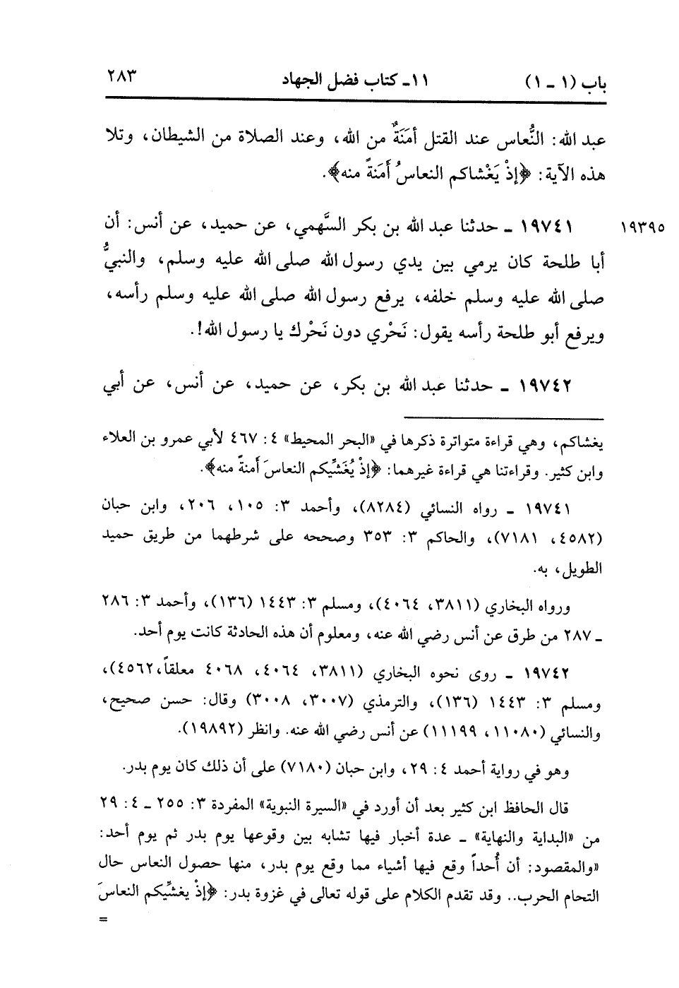 19742- حَدَّثَنَا عَبْدُ اللهِ بْنُ بَكْرٍ ، عَنْ حُمَيْدٍ ، عَنْ أَنَسٍ ، عَنْ أَبِي طَلْحَةَ ، قَالَ : كُنْتُ فِيمَنْ أُنْزِلَ عَلَيْهِ النُّعَاسُ يَوْمَ أُحُدٍ. (5/311).