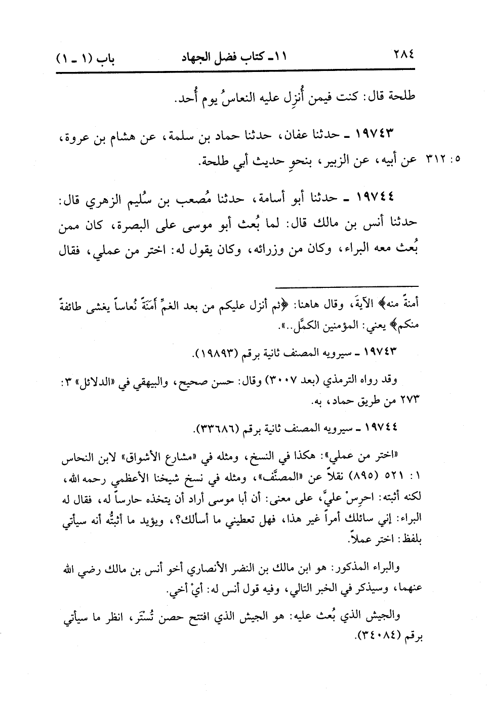 19744- حَدَّثَنَا أَبُو أُسَامَةَ ، حَدَّثَنَا مُصْعَبُ بْنُ سُلَيْمٍ الزُّهْرِيُّ , قَالَ : حدَّثَنَا أَنَسُ بْنُ مَالِكٍ ، قَالَ : لَمَّا بُعِثَ أَبُو مُوسَى عَلَى الْبَصْرَةِ كَانَ مِمَّنْ بُعِثَ مَعَهُ الْبَرَاءُ , وَكَانَ مِنْ وَزرَائِهِ وَكَانَ يَقُولُ لَهُ : اختر من عملي ، فَقَالَ : الْبَرَاءُ : وَمُعْطِيَّ أَنْتَ مَا سَأَلْتُك ؟ قَالَ : نَعَمْ ، قَالَ : أَمَا إنِّي لاَ أَسْأَلُك إمَارَةَ مِصْرَ ، وَلاَ جِبَايَتَهُ , وَلَكِنْ أَعْطِنِي قَوْسِي وَرُمْحِي , وَفَرَسِي وَسَيْفِي , وَدِرْعِي , وَالْجِهَادَ فِي سَبِيلِ اللهِ ، فَبَعَثَهُ عَلَى جَيْشٍ ، فَكَانَ أَوَّلَ مَنْ قُتِلَ. (5/312).
