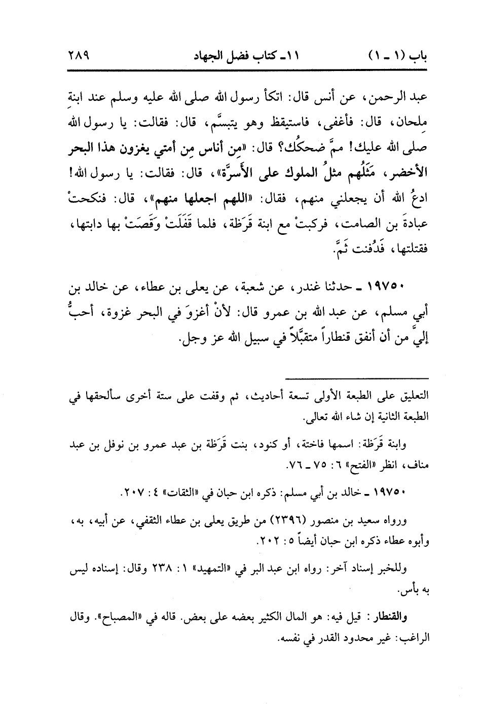 19749- حَدَّثَنَا حُسَيْنُ بْنُ عَلِيٍّ ، عَنْ زَائِدَةَ ، عَنْ عَبْدِ اللهِ بْنِ عَبْدِ الرَّحْمَنِ ، عَنْ أَنَسٍ ، قَالَ : اتَّكَأَ رَسُولُ اللهِ صَلَّى الله عَلَيْهِ وَسَلَّمَ عِنْدَ ابْنَةِ مِلْحَانَ ، قَالَ : فَأَغْفَى فَاسْتَيْقَظَ وَهُوَ يَتَبَسَّمُ ، قَالَ : فَقَالَتْ : يَا رَسُولَ اللهِ صَلَّى اللَّهُ عَلَيْك ، مِمَّ ضَحِكُك ؟ قَالَ : مِنْ أُنَاسٍ مِنْ أُمَّتِي يَغْزُونَ هَذَا الْبَحْرَ الأَخْضَرَ ، مَثَلُهُمْ مَثَلُ الْمُلُوكِ عَلَى الأَسِرَّةِ ، قَالَ : فَقَالَتْ : يَا رَسُولَ اللهِ ، ادْعُ اللَّهَ أَنْ يَجْعَلَنِي مِنْهُمْ ، فَقَالَ : اللَّهُمَّ اجْعَلْهَا مِنْهُمْ ، قَالَ : فَنَكَحْت عُبَادَةَ بْنَ الصَّامِتِ فَرَكِبْت مَعَ ابْنِهِ قَرَظَةَ ، فَلَمَّا قَفَلَتْ وَقَصَتْ بِهَا دَابَّتُهَا فَقَتَلَتْهَا فَدُفِنَتْ ثَمَّ.