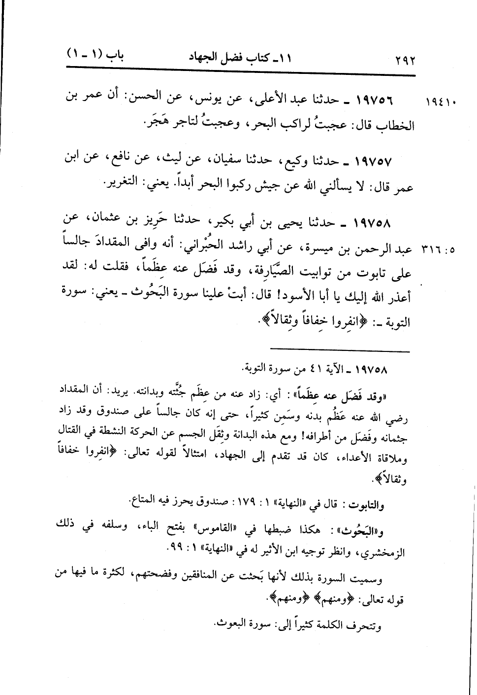 19758- حَدَّثَنَا يَحْيَى بْنُ أَبِي بكير ، حَدَّثَنَا حَرِيزُ بْنُ عُثْمَانَ ، عَنْ عَبْدِ الرَّحْمَنِ بْنِ مَيْسَرَةَ ، عَنْ أَبِي رَاشِدٍ الْحُبْرَانِيِّ ، أَنَّهُ وَافَى الْمِقْدَادَ جَالِسًا عَلَى تَابُوتٍ مِنْ تَوَابِيتِ الصَّيَارِفَةِ وَقَدْ فَضَلَ عَنْهُ عِظَمًا فَقُلْت لَهُ : لقد أَعْذَرَ اللَّهُ إلَيْك يَا أَبَا الأَسْوَدِ ، قَالَ : أَبَتْ عَلَيْنَا سُورَةُ البَحُوث ، يَعْنِي سُورَةَ التَّوْبَةِ : {انْفِرُوا خِفَافًا وَثِقَالاَ} . (5/315).