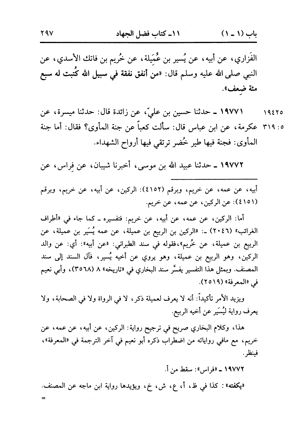 19771- حَدَّثَنَا حُسَيْنُ بْنُ عَلِيٍّ ، عَنْ زَائِدَةَ , قَالَ : حدَّثَنَا مَيْسَرَةُ ، عَنْ عِكْرِمَةَ ، عَنِ ابْنِ عَبَّاسٍ ، قَالَ : سَأَلْتُ كَعْبًا عَنْ جَنَّةِ الْمَأْوَى ، فَقَالَ : أَمَّا جَنَّةُ الْمَأْوَى فَجَنَّةٌ فِيهَا طَيْرٌ خُضْرٌ تَرْتَقِي فِيهَا أَرْوَاحَ الشُّهَدَاءِ. (5/318).