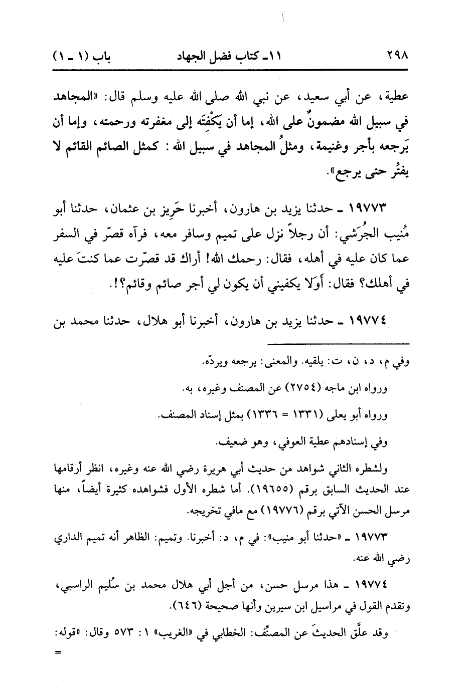 19773- حَدَّثَنَا يَزِيدُ بْنُ هَارُونَ ، حَدَّثَنَا حَرِيزُ بْنُ عُثْمَانَ ، حَدَّثَنَا أَبُو مُنِيبٍ الْجُرَشِيِّ ، أَنَّ رَجُلاً نَزَلَ عَلَى تَمِيمٍ وَسَافَرَ مَعَهُ فَرَآهُ قَصَرَ فِي السَّفَرِ عَمَّا كَانَ عَلَيْهِ فِي أَهْلِهِ ، فَقَالَ : رَحِمَك اللَّهُ ، أَرَاك قَدْ قَصّرْت عَمَّا كُنْت عَلَيْهِ فِي أَهْلِكَ ؟ فَقَالَ : أَوْ لاَ يَكْفِينِي ، أَنَّ يكون لِي أَجْرَ صَائِمٍ وَقَائِمٍ.