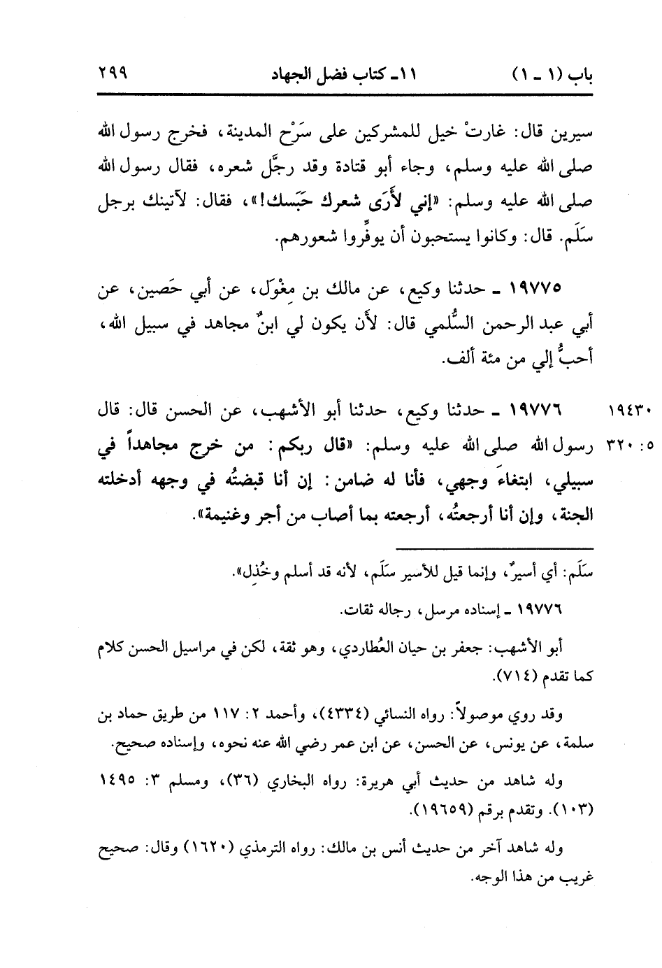 19776- حَدَّثَنَا وَكِيعٌ ، حَدَّثَنَا أَبُو الأَشْهَبِ ، عَنِ الْحَسَنِ ، قَالَ : قَالَ رَسُولُ اللهِ صَلَّى الله عَلَيْهِ وَسَلَّمَ : قَالَ رَبُّكُمْ : مَنْ خَرَجَ مُجَاهِدًا فِي سَبِيلِي ابْتِغَاءَ وَجْهِي فَأَنَا لَهُ ضَامِنٌ ، إِنْ أَنَا قَبَضْته فِي وَجْهِهِ أَدْخَلْته الْجَنَّةَ , وَإِنْ أَنَا أَرْجَعْته أَرْجَعْته بِمَا أَصَابَ مِنْ أَجْرٍ وَغَنِيمَةٍ. (5/319).