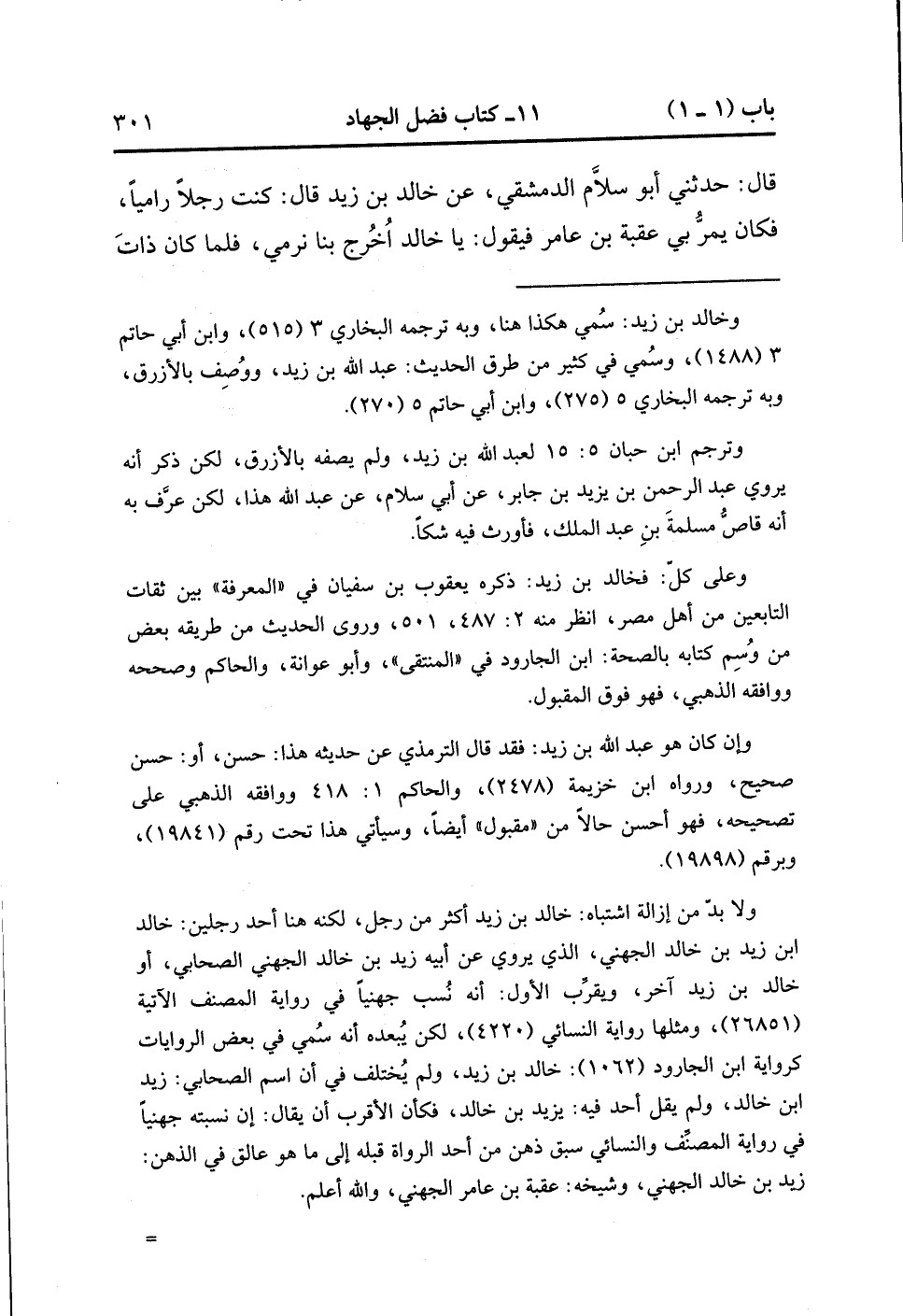 19779- حَدَّثَنَا عِيسَى بْنُ يُونُسَ ، عَنْ عَبْدِ الرَّحْمَنِ بْنِ يَزِيدَ بْنِ جَابِرٍ ، قَالَ : حدَّثَنِي أَبُو سَلاَّمٍ الدِّمَشْقِيُّ ، عَنْ خَالِدِ بْنِ زَيْدٍ ، قَالَ : كُنْتُ رَجُلاً رَامِيًا ، فَكَانَ يَمُرُّ بِي عُقْبَةُ بْنُ عَامِرٍ فَيَقُولُ : يَا خَالِدُ اخْرُجْ بِنَا نَرْمِي ، فَلَمَّا كَانَ ذَاتَ يَوْمٍ أَبْطَأَتْ عَنْهُ ، فَقَالَ : يَا خَالِدُ تَعَالَ أُخْبِرُك مَا قَالَ رَسُولُ اللهِ صَلَّى الله عَلَيْهِ وَسَلَّمَ : إنَّ اللَّهَ يُدْخِلُ بِالسَّهْمِ الْوَاحِدِ ثَلاَثَةَ نَفَرٍ الْجَنَّةَ : صَانِعُهُ يَحْتَسِبُ فِي صَنْعَتِهِ الْخَيْرَ وَالرَّامِي بِهِ وَمُنْبِلُهُ وَلَيْسَ اللَّهْوُ إِلاَّ فِي ثَلاَثٍ : تَأْدِيبُ الرَّجُلِ فَرَسَهُ وَمُلاَعَبَتُهُ أَهْلَهُ وَرَمْيُهُ بِقَوْسِهِ وَنَبْلِهِ وَمَنْ تَرَكَ الرَّمْيَ بَعْدَ مَا عَلِمَهُ فَهِيَ نِعْمَةٌ تَرَكَهَا ، أَوْ كَفَرَهَا. (5/320).