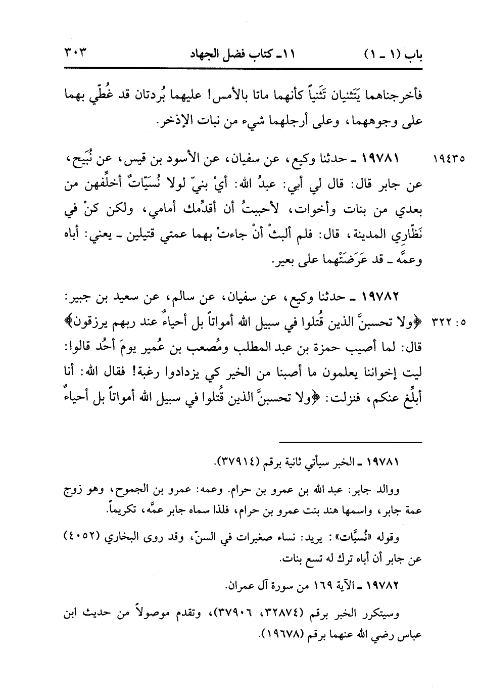 19782- حَدَّثَنَا وَكِيعٌ ، حَدَّثَنَا سُفْيَانُ ، عَنْ سَالِمٍ ، عَنْ سَعِيدِ بْنِ جُبَيْرٍ : {وَلاَ تَحْسَبَنَّ الَّذِينَ قُتِلُوا فِي سَبِيلِ اللهِ أَمْوَاتًا بَلْ أَحْيَاءٌ عِنْدَ رَبِّهِمْ يُرْزَقُونَ} قَالَ : لَمَّا أُصِيبَ حَمْزَةُ بْنُ عَبْدِ الْمُطَّلِبِ وَمُصْعَبُ بْنُ عُمَيْرٍ يَوْمَ أُحُدٍ ، قَالُوا : لَيْتَ إخْوَانَنَا يَعْلَمُونَ مَا أَصَبْنَا مِنَ الْخَيْرِ كَيْ يَزْدَادُوا رَغْبَةً ، فَقَالَ اللَّهُ : أَنَا أُبَلِّغُ عَنْكُمْ فَنَزَلَتْ : {وَلاَ تَحْسَبَنَّ الَّذِينَ قُتِلُوا فِي سَبِيلِ اللهِ أَمْوَاتًا بَلْ أَحْيَاءٌ عِنْدَ رَبِّهِمْ يُرْزَقُونَ فَرِحِينَ} إلَى قَوْلِهِ {المؤمنين}. (5/321).