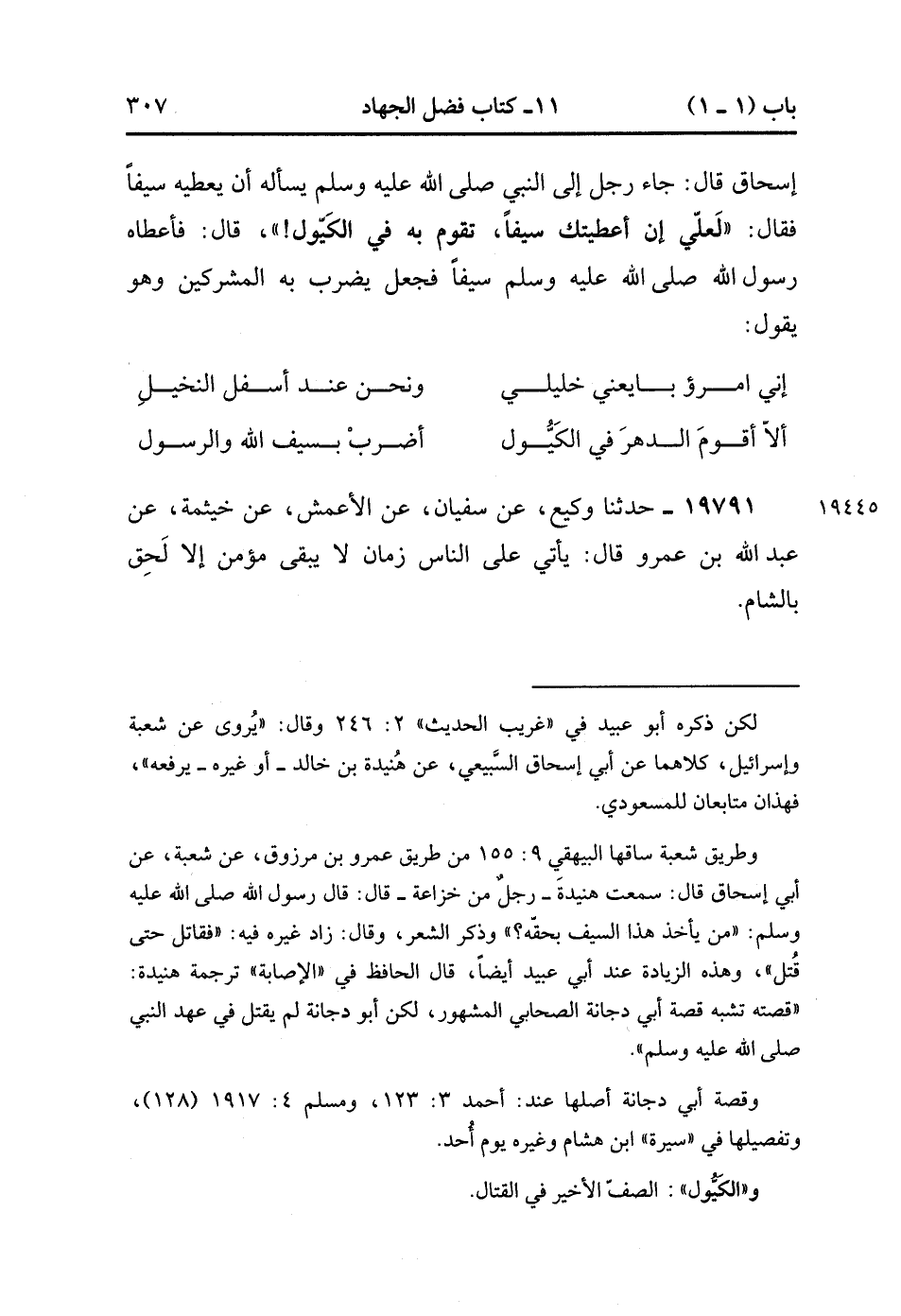 19790- حَدَّثَنَا يَزِيدُ بْنُ هَارُونَ ، حَدَّثَنَا الْمَسْعُودِيُّ ، عَنْ أَبِي إِسْحَاقَ ، قَالَ : جَاءَ رَجُلٌ إلَى النَّبِيِّ صَلَّى الله عَلَيْهِ وَسَلَّمَ يَسْأَلُهُ أَنْ يُعْطِيَهُ سَيْفًا ، فَقَالَ : لَعَلِّي إِنْ أَعْطَيْتُك سَيْفًا تَقُومُ بِهِ فِي الْكَيّولِ ، قَالَ : فَأَعْطَاهُ رَسُولُ اللهِ صَلَّى الله عَلَيْهِ وَسَلَّمَ سَيْفًا فَجَعَلَ يَضْرِبُ بِهِ الْمُشْرِكِينَ وَهُوَ يَقُولُ :
