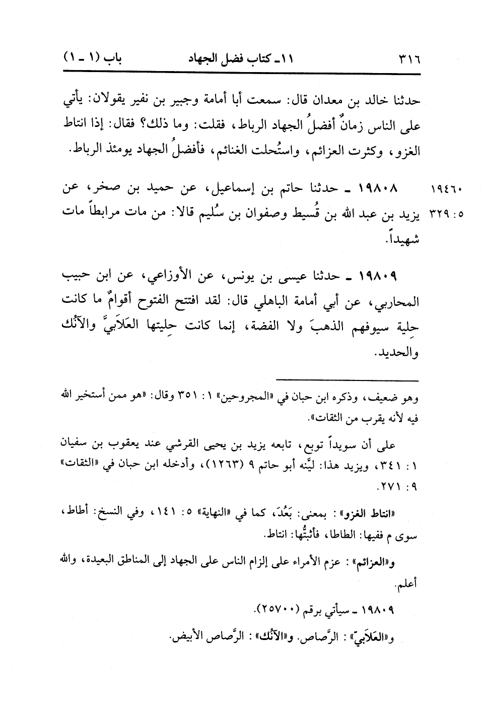 19809- حَدَّثَنَا عِيسَى بْنُ يُونُسَ ، عَنِ الأَوْزَاعِيِّ ، عَنِ ابْنِ حَبِيبٍ الْمُحَارِبِيِّ ، عَنْ أَبِي أُمَامَةَ الْبَاهِلِيِّ ، قَالَ : لَقَدَ افْتَتَحَ الْفُتُوحَ أَقْوَامٌ مَا كَانَتْ حِلْيَةُ سُيُوفِهِمَ الذَّهَبَ ، وَلاَ الْفِضَّةَ ، إنَّمَا كَانَتْ حِلْيَتُهَا الْعَلاَبِيَّ وَالآنُكَ وَالْحَدِيدَ. (5/329).