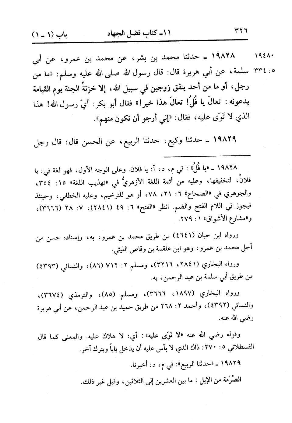 19828- حَدَّثَنَا مُحَمَّدُ بْنُ بِشْرٍ ، عَنْ مُحَمَّدِ بْنِ عَمْرٍو ، عَنْ أَبِي سَلَمَةَ ، عَنْ أَبِي هُرَيْرَةَ ، قَالَ : قَالَ رَسُولُ اللهِ صَلَّى الله عَلَيْهِ وَسَلَّمَ : مَا مِنْ رَجُلٍ ، أَوْ مَا مِنْ أَحَدٍ يُنْفِقُ زَوْجَيْنِ فِي سَبِيلِ اللهِ إِلاَّ خَزَنَةُ الْجَنَّةِ يَوْمَ الْقِيَامَةِ يَدْعُونَهُ : تَعَالَ يَا فُلاَنُ ، تَعَالَ هَذِهِ خَيْرٌ ، فَقَالَ أَبُو بَكْرٍ : أَيْ رَسُولَ اللهِ ، هَذَا الَّذِي لاَ تَوَى عَلَيْهِ ، فَقَالَ : إنِّي أَرْجُو أَنْ تَكُونَ مِنْهُمْ. (5/333).
