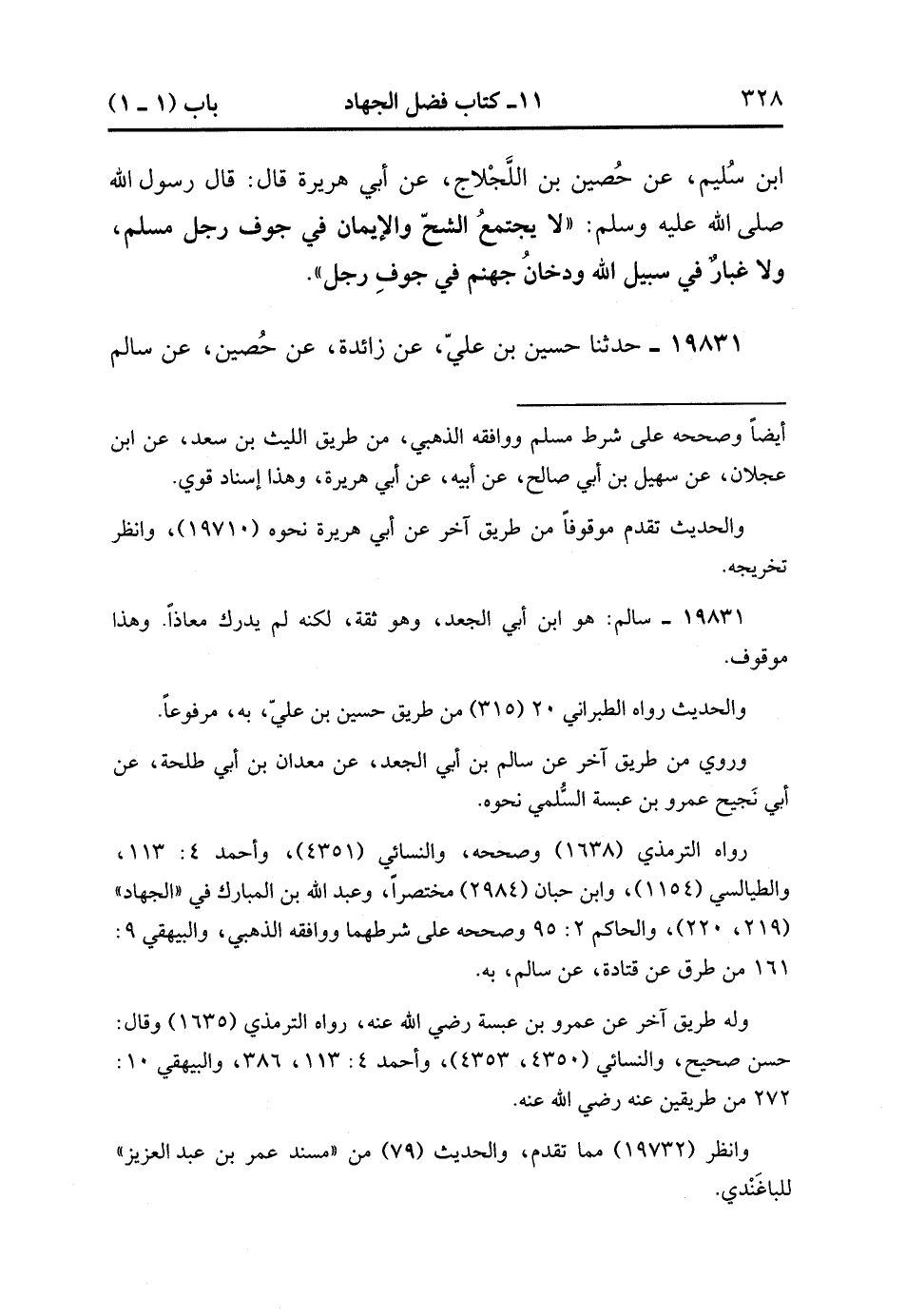 19830- حَدَّثَنَا عَبْدَةُ بْنُ سُلَيْمَانَ ، عَنْ مُحَمَّدِ بْنِ عَمْرِو بْنِ صَفْوَانَ بْنِ سُلَيْمٍ ، عَنْ حُصَيْنٍ بْنِ اللَّجْلاَجِ ، عَنْ أَبِي هُرَيْرَةَ ، قَالَ : قَالَ رَسُولُ اللهِ صَلَّى الله عَلَيْهِ وَسَلَّمَ : لاَ يَجْتَمِعُ الشُّحُّ وَالإِيمَانُ فِي جَوْفِ رَجُلٍ مُسْلِمٍ ، وَلاَ غُبَارٌ فِي سَبِيلِ اللهِ وَدُخَانُ جَهَنَّمَ فِي جَوْفِ رَجُلٍ.