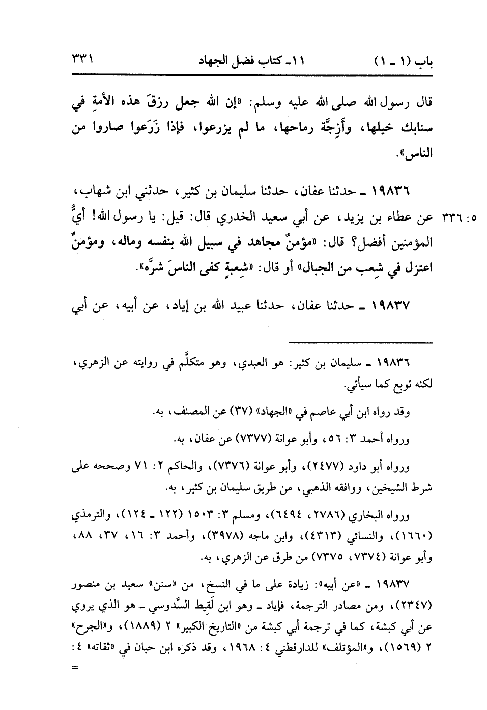 19836- حَدَّثَنَا عَفَّانُ ، عَنْ سُلَيْمَانَ بْنِ كَثِيرٍ حَدَّثَنِي ابْنُ شِهَابٍ ، عَنْ عَطَاءِ بْنِ يَزِيدَ ، عَنْ أَبِي سَعِيدٍ الْخُدْرِيِّ ، قَالَ قِيلَ : يَا رَسُولَ اللهِ ، أَيُّ الْمُؤْمِنِينَ أَفْضَلُ ؟ قَالَ : مُؤْمِنٌ مُجَاهِدٌ فِي سَبِيلِ اللهِ بِنَفْسِهِ وَمَالِهِ , وَمُؤْمِنٌ اعْتَزَلَ فِي شِعْبٍ مِنَ الْجِبَالِ , أَوَ قَالَ شُعْبَةٍ : كَفَى النَّاسَ شَرَّهُ. (5/335).