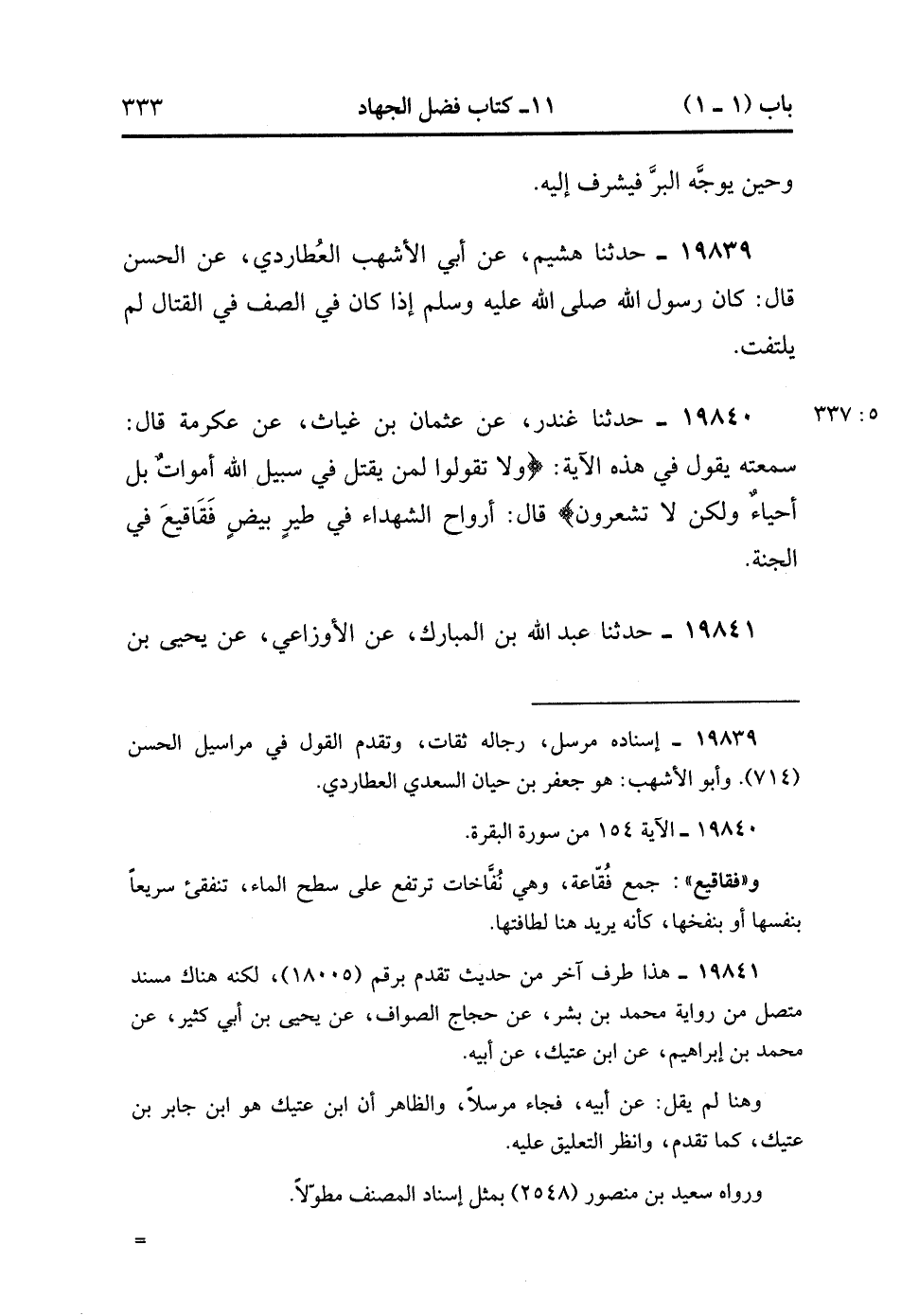 19839- حَدَّثَنَا هُشَيْمٌ ، عَنْ أَبِي الأَشْهَبَ الْعُطَارِدِيِّ ، عَنِ الْحَسَنِ ، قَالَ : قَالَ رَسُولُ اللهِ صَلَّى الله عَلَيْهِ وَسَلَّمَ : إذَا كَانَ فِي الصَّفِّ فِي الْقِتَالِ لَمْ يَلْتَفِتْ. (5/336).