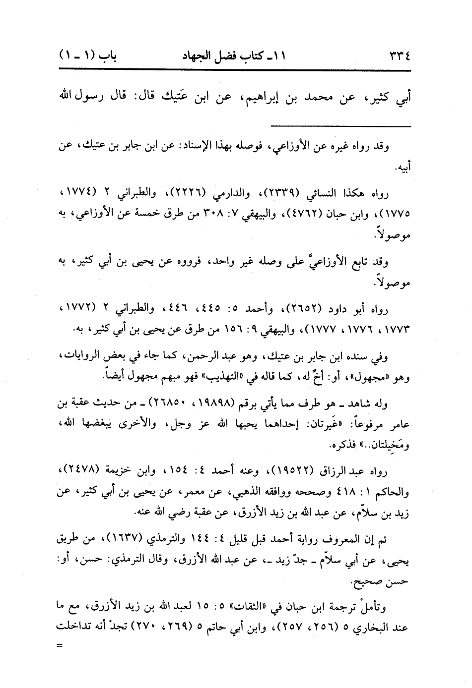 19841- حَدَّثَنَا عَبْدُ اللهِ بْنِ الْمُبَارَكِ ، عَنِ الأَوْزَاعِيِّ ، عَنْ يَحْيَى بْنِ أَبِي كَثِيرٍ ، عَنْ مُحَمَّدِ بْنِ إبْرَاهِيمَ ، عَنِ ابْنِ عَتِيكٍ ، قَالَ : قَالَ رَسُولُ اللهِ صَلَّى الله عَلَيْهِ وَسَلَّمَ : أَمَّا مَا يُحَبُّ مِنَ الْخُيَلاَءِ ، فَالرَّجُلُ يَخْتَالُ بِسَيْفِهِ عِنْدَ الْقِتَالِ ، وَعِنْدَ الصَّدَقَةِ ، وَلاَ يُحِبُّ الْمَرَحَ. (5/337).