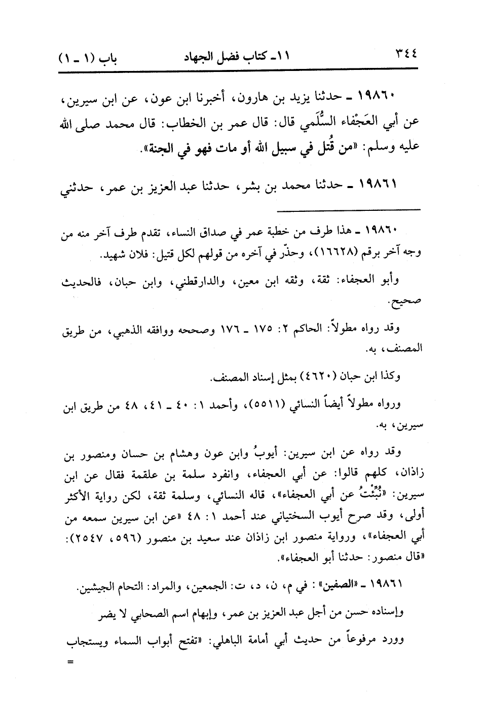 19860- حَدَّثَنَا يَزِيدُ بْنُ هَارُونَ ، أَخْبَرَنَا ابْنُ عَوْنٍ ، عَنِ ابْنِ سِيرِينَ ، عَنْ أَبِي الْعَجْفَاءِ السُّلَمِيِّ ، قَالَ : قَالَ عُمَرُ بْنُ الْخَطَّابِ : قَالَ مُحَمَّدٌ صَلَّى الله عَلَيْهِ وَسَلَّمَ : مَنْ قُتِلَ فِي سَبِيلِ اللهِ ، أَوْ مَاتَ فَهُوَ فِي الْجَنَّةِ.
