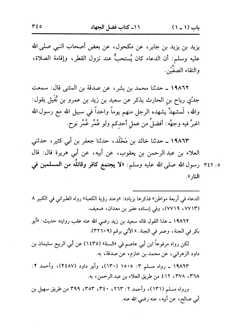 19863- حَدَّثَنَا خَالِدُ بْنُ مَخْلَدٍ ، حَدَّثَنَا جَعْفَرُ بْنُ أَبِي كَثِيرٍ , حَدَّثَنِي الْعَلاَءُ بْنُ عَبْدِ الرَّحْمَنِ بْنِ يَعْقُوبَ ، عَنْ أَبِيهِ ، عَنْ أَبِي هُرَيْرَةَ ، قَالَ : قَالَ رَسُولُ اللهِ صَلَّى الله عَلَيْهِ وَسَلَّمَ : لاَ يَجْتَمِعُ كَافِرٌ وَقَاتِلُهُ مِنَ الْمُسْلِمِينَ فِي النَّارِ. (5/341).