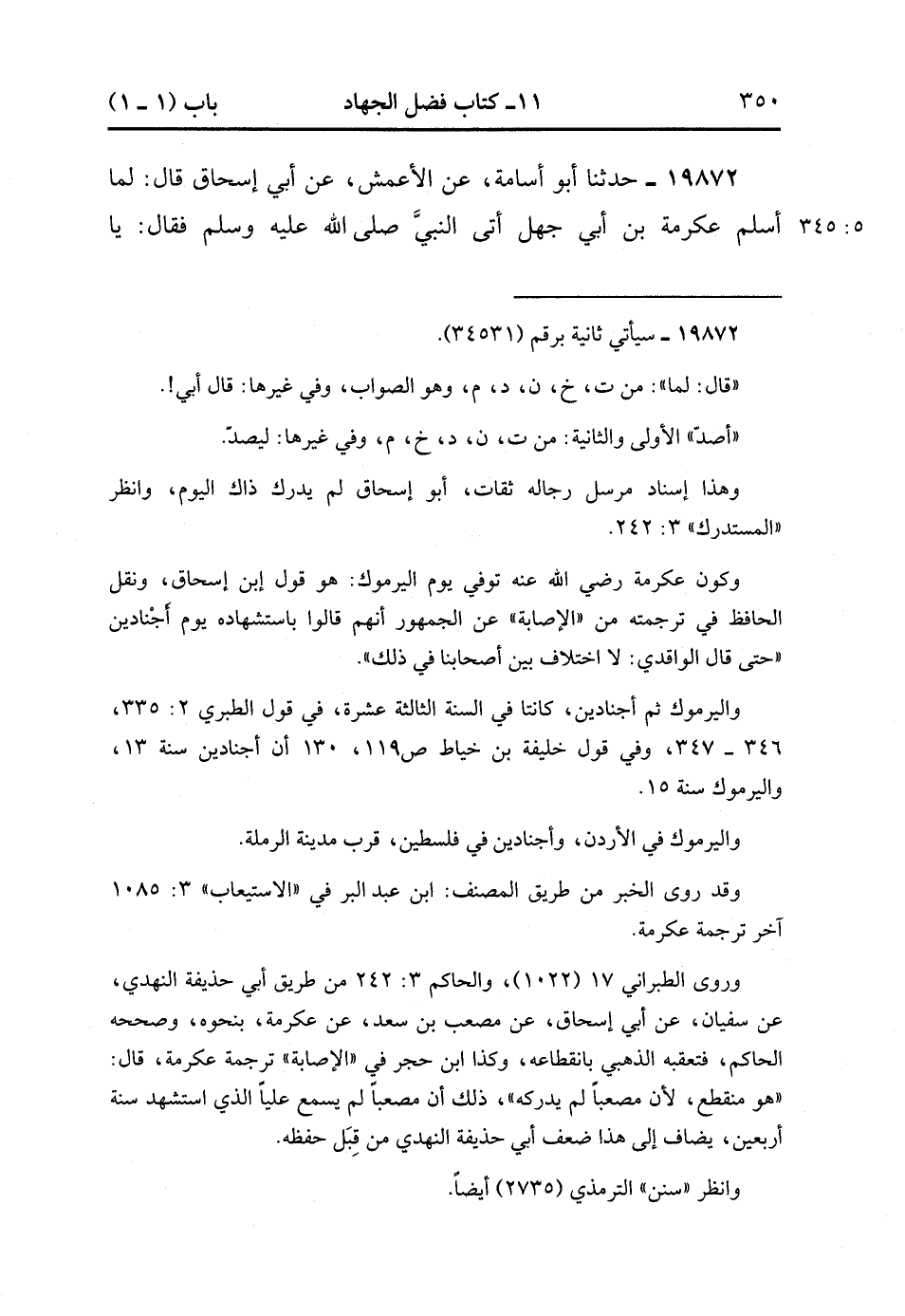 19872- حَدَّثَنَا أَبُو أُسَامَةَ ، عَنِ الأَعْمَشِ ، عَنْ أَبِي إِسْحَاقَ ، قَالَ : لَمَّا أَسْلَمَ عِكْرِمَةُ بْنُ أَبِي جَهْلٍ أَتَى النَّبِيَّ صَلَّى الله عَلَيْهِ وَسَلَّمَ ، فَقَالَ : يَا رَسُولَ اللهِ وَاللَّهِ لاَ أَتْرُكُ مَقَامًا قُمْته لِيُصَدَّ بِهِ عَنْ سَبِيلِ اللهِ إِلاَّ قُمْت مِثْلَيْهِ فِي سَبِيلِ اللهِ ، وَلاَ أَتْرُكُ نَفَقَةً أَنْفَقْتهَا أصُدُّ بِهَا عَنْ سَبِيلِ اللهِ إلاَّ أَنْفَقْتُ مِثْلَيْهَا فِي سَبِيلِ اللهِ ، فَلَمَّا كَانَ يَوْمَ الْيَرْمُوكِ نَزَلَ فَتَرَجَّلَ فَقَاتَلَ قِتَالاً شَدِيدًا فَقُتِلَ , فَوُجِدَ بِهِ بِضْعٌ وَسَبْعُونَ مِنْ بَيْنِ طَعْنَةٍ وَرَمْيَةٍ وَضَرْبَةٍ. (5/344).