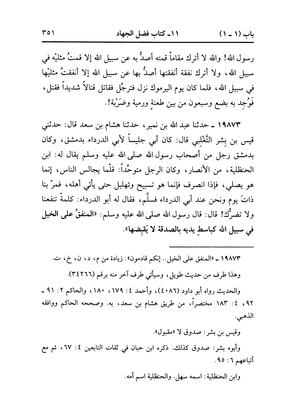 19873- حَدَّثَنَا عَبْدُ اللهِ بْنُ نُمَيْرٍ ، حَدَّثَنَا هِشَامُ بْنُ سَعْدٍ ، قَالَ : حدَّثَنِي قَيْسُ بْن بِشْرٍ التَّغْلِبِيُّ ، قَالَ : كَانَ أَبِي جَلِيسًا لأَبِي الدَّرْدَاءِ بِدِمَشْقَ , وَكَانَ بِدِمَشْقَ رَجُلٌ مِنْ أَصْحَابِ رَسُولِ اللهِ صَلَّى الله عَلَيْهِ وَسَلَّمَ ، يُقَالَ لَهُ ابْنُ الْحَنْظَلِيَّةِ مِنَ الأَنْصَارِ , وَكَانَ الرَّجُلُ مُتَوَحِّدًا ، قَلَّمَا يُجَالِسُ النَّاسَ ، إنَّمَا هُوَ يُصَلِّي فَإِذَا انْصَرَفَ , فَإِنَّمَا هُوَ تَسْبِيحٌ وَتَهْلِيلٌ , حَتَّى يَأْتِيَ أَهْلَهُ , فَمَرَّ بِنَا ذَاتَ يَوْمٍ وَنَحْنُ عِنْدَ أَبِي الدَّرْدَاءِ فَسَلَّمَ ، فَقَالَ لَهُ أَبُو الدَّرْدَاءِ كَلِمَةً تَنْفَعُنَا ، وَلاَ تَضُرُّك ، قَالَ : قَالَ رَسُولُ اللهِ صَلَّى الله عَلَيْهِ وَسَلَّمَ : الْمُنْفِقُ عَلَى الْخَيْلِ فِي سَبِيلِ اللهِ ، كَبَاسِطِ يَدَيْهِ بِالصَّدَقَةِ لاَ يَقْبِضُهَا ، ثُمَّ مَرَّ بِنَا يَوْمًا آخَرَ فَسَلَّمَ ، فَقَالَ أَبُو الدَّرْدَاءَ : كَلِمَةٌ تَنْفَعُنَا وَلاَ تَضُرُّكَ , قَالَ : قَالَ رَسُولُ اللهِ صَلَّى الله عَلَيْهِ وَسَلَّمَ : إنَّكُمْ قَادِمُونَ عَلَى إخْوَانِكُمْ فَأَصْلِحُوا رِحَالَكُمْ وَأَصْلِحُوا لِبَاسَكُمْ حَتَّى تَكُونُوا كَأَنَّكُمْ شَامَةً فِي النَّاسِ , فَإِنَّ اللَّهَ لاَ يُحِبُّ الْفُحْشَ وَالتَّفَحُّشَ. (5/345).