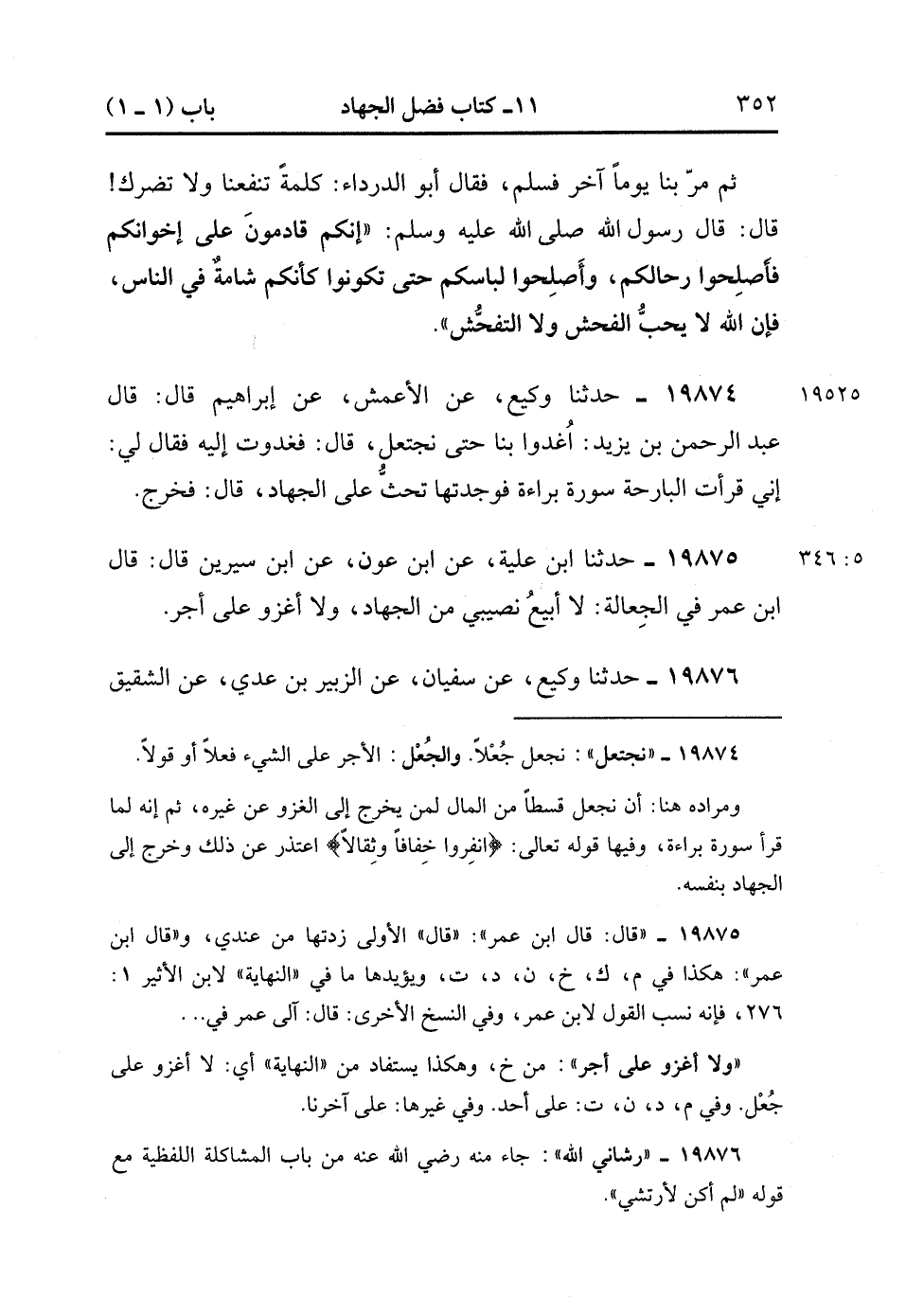 19875- حَدَّثَنَا ابْنُ عُلَيَّةَ ، عَنِ ابْنِ عَوْنٍ ، عَنِ ابْنِ سِيرِينَ ، قَالَ : ابن عُمَرَ فِي الْجَعَالَةِ : لاَ أَبِيعُ نَصِيبِي مِنَ الْجِهَادِ ، وَلاَ أَغْزُو عَلَى أَجْرٍ. (5/345).