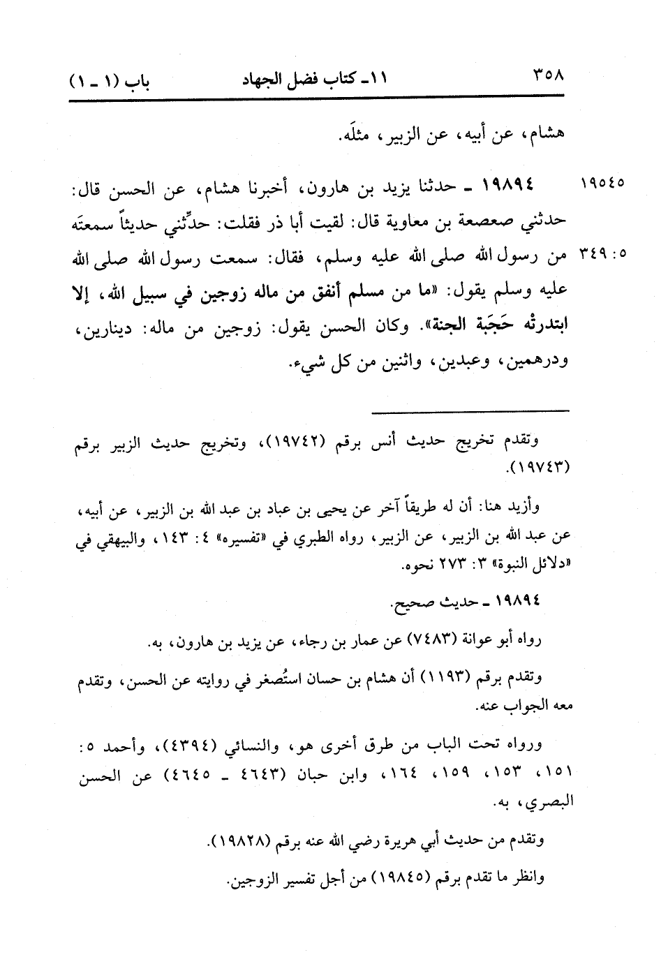 19894- حَدَّثَنَا يَزِيدُ بْنُ هَارُونَ أَنَا هِشَامُ ، عَنِ الْحَسَنِ ، قَالَ : حدَّثَنِي صَعْصَعَةُ بْنُ مُعَاوِيَةَ ، قَالَ : لَقِيت أَبَا ذَرٍّ فَقُلْت : حَدَّثَنِي حَدِيثًا سَمِعْته مِنْ رَسُولِ اللهِ صَلَّى الله عَلَيْهِ وَسَلَّمَ ، فَقَالَ : سَمِعْتُ رَسُولَ اللهِ صَلَّى الله عَلَيْهِ وَسَلَّمَ يَقُولُ : مَا مِنْ مُسْلِمٍ أَنْفَقَ مِنْ مَالِهِ زَوْجَيْنِ فِي سَبِيلِ اللهِ إِلاَّ ابْتَدَرَتْهُ حَجَبَةُ الْجَنَّةِ ، وَكَانَ الْحَسَنُ يَقُولُ : زَوْجَيْنِ مِنْ مَالِهِ : دِينَارَيْنِ وَدِرْهَمَيْنِ وَعَبْدَيْنِ ، وَاثْنَتَيْنِ مِنْ كُلِّ شَيْءٍ. (5/348).