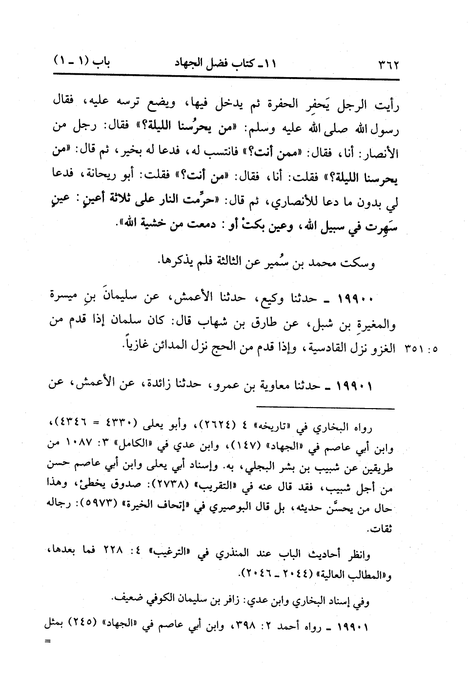 19901- حَدَّثَنَا مُعَاوِيَةُ بْنُ عَمْرِو ، حَدَّثَنَا زَائِدَةُ ، عَنِ الأَعْمَشِ ، عَنْ أَبِي صَالِحٍ ، عَنْ أَبِي هُرَيْرَةَ ، أَنَّ النَّبِيَّ صَلَّى الله عَلَيْهِ وَسَلَّمَ ، قَالَ : مَنْ كُلِمَ فِي سَبِيلِ اللهِ ، وَاللَّهُ أَعْلَمُ بِمَنْ كُلِمَ فِي سَبِيلِهِ , يَجِيءُ يَوْمَ الْقِيَامَةِ وَجُرْحُهُ كَهَيْئَتِهِ يَوْمَ جُرِحَ. (5/351).