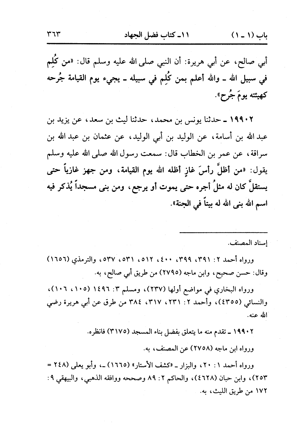19902- حَدَّثَنَا يُونُسُ بْنُ مُحَمَّدٍ ، حَدَّثَنَا لَيْثُ بْنُ سَعْدٍ ، عَنْ يَزِيدَ بْنِ عَبْدِ اللهِ بْنِ أُسَامَةَ ، عَنِ الْوَلِيدِ بْنِ أَبِي الْوَلِيدِ ، عَنْ عُثْمَانَ بْنِ عَبْدِ اللهِ بْنِ سُرَاقَةَ ، عَنْ عُمَرَ بْنِ الْخَطَّابِ ، قَالَ : سَمِعْتُ رَسُولَ اللهِ صَلَّى الله عَلَيْهِ وَسَلَّمَ يَقُولُ : مَنْ أَظَلَّ رَأْسَ غَازٍ أَظَلَّهُ اللَّهُ يَوْمَ الْقِيَامَةِ , وَمَنْ جَهَّزَ غَازِيًا حَتَّى يَسْتَقِلَّ كَانَ لَهُ مِثْلُ أَجْرِهِ حَتَّى يَمُوتَ ، أَوْ يَرْجِعَ , وَمَنْ بَنَى مَسْجِدًا يُذْكَرُ فِيهِ اسْمُ اللهِ , بَنَى اللَّهُ لَهُ بَيْتًا فِي الْجَنَّةِ. (5/351).