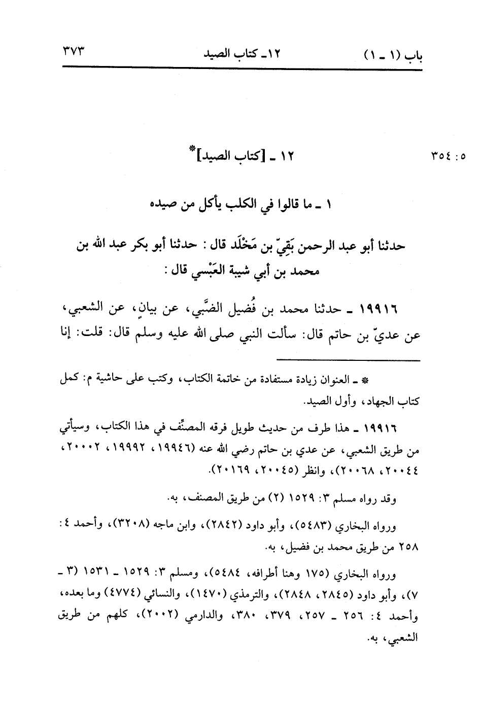 19916- حَدَّثَنَا مُحَمَّدُ بْنُ فُضَيْلٍ الضَّبِّيُّ ، عَنْ بَيَانَ ، عَنِ الشَّعْبِيِّ ، عَنْ عَدِيِّ بْنِ حَاتِمٍ ، قَالَ : سَأَلْتُ النَّبِيَّ صَلَّى الله عَلَيْهِ وَسَلَّمَ ، قَالَ : قُلْتُ : إنَّا قَوْمٌ نَصِيدُ بِهَذِهِ الْكِلاَبِ ، قَالَ : إذَا أَرْسَلْت كِلاَبَك الْمُعَلَّمَةَ وَذَكَرْت اسْمَ اللهِ عَلَيْهَا فَكُلْ مِمَّا أَمْسَكْنَ عَلَيْك , وَإِنْ قَتَلْنَ إِلاَّ أَنْ يَأْكُلْنَ ، فَإِنْ أَكَلْنَ فَلاَ تَأْكُلْ , فَإِنِّي أَخَافُ أَنْ يَكُونَ إنَّمَا أَمْسَكَ عَلَى نَفْسِهِ , وَإِنْ خَالَطَهَا كِلاَبٌ أُخْرَى فَلاَ تَأْكُلْ. (5/353).
