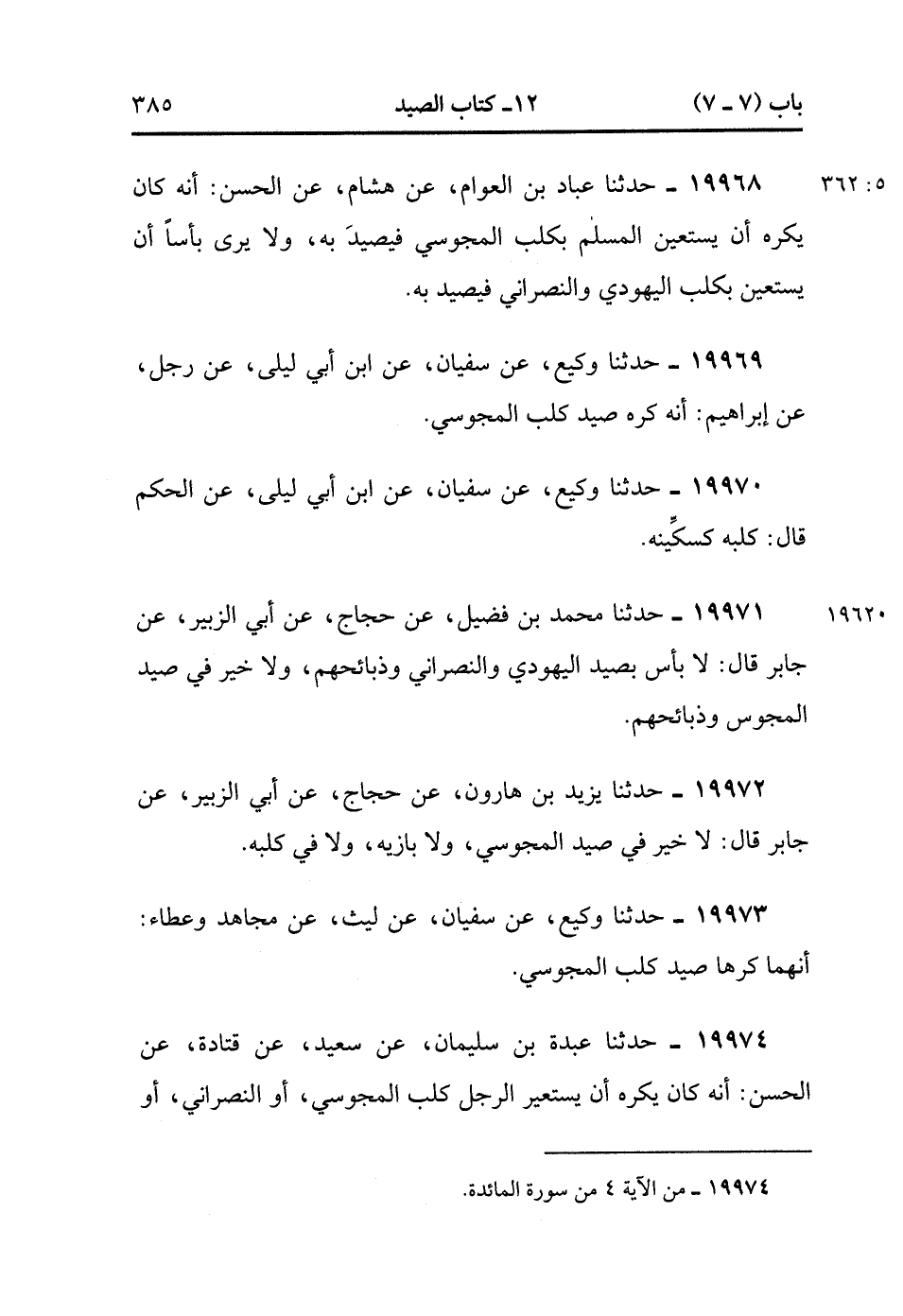 19968- حَدَّثَنَا عَبَّادُ بْنُ الْعَوَّامِ ، عَنْ هِشَامِ ، عَنِ الْحَسَنِ ، أَنَّهُ كَانَ يُكْرَهُ أَنْ يَسْتَعِينَ الْمُسْلِمُ بِكَلْبِ الْمَجُوسِيِّ فَيَصِيدُ بِهِ ، وَلاَ يَرَى بَأْسًا أَنْ يَسْتَعِينَ بِكَلْبِ الْيَهُودِيِّ وَالنَّصْرَانِيِّ فَيَصِيدَ بِهِ. (5/361).