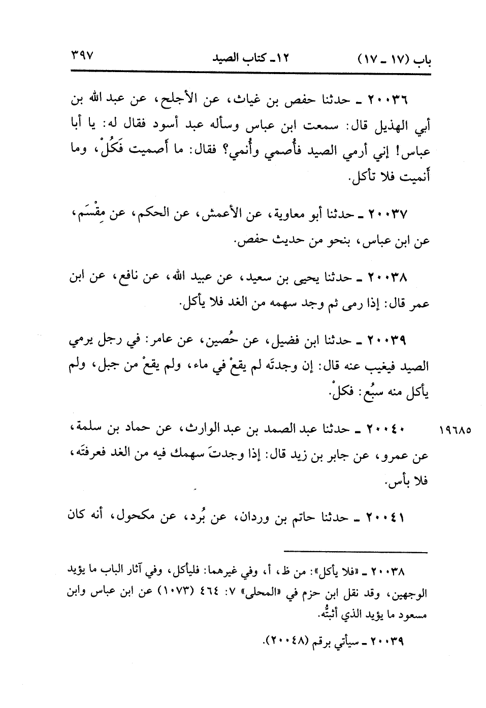 20036- حَدَّثَنَا حَفْصُ بْنُ غِيَاثٍ ، عَنِ الأَجْلَحِ ، عَنْ عَبْدِ اللهِ بْنِ أَبِي الْهُذَيْلِ ، قَالَ : سَأَلْتُ ابْنَ عَبَّاسٍ وَسَأَلَهُ عَبْدٌ أَسْوَدُ ، فَقَالَ لَهُ : يَا أَبَا عَبَّاسٍ ، إنِّي أَرْمِي الصَّيْدَ فَأُصْمِي وَأُنْمِي ، فَقَالَ : مَا أَصْمَيْتَ فَكُلْ وَمَا أَنْمَيْت فَلاَ تَأْكُلْ.