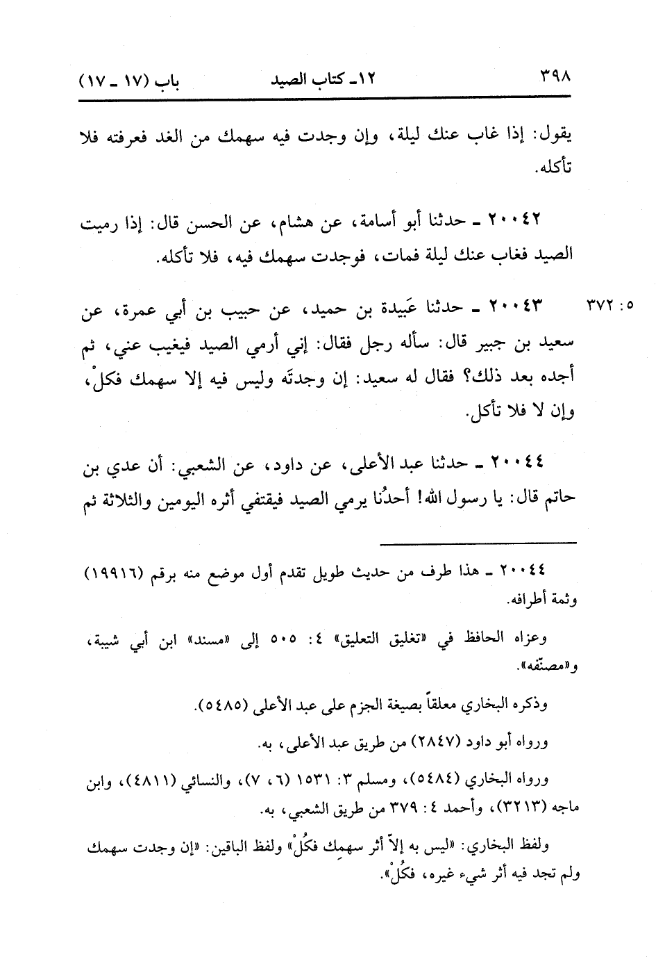 20044- حَدَّثَنَا عَبْدُ الأَعْلَى ، عَنْ دَاوُدَ ، عَنِ الشَّعْبِيِّ ، أَنَّ عَدِيَّ بْنَ حَاتِمٍ ، قَالَ : يَا رَسُولَ اللهِ ، أَحَدُنَا يَرْمِي الصَّيْدَ فَيَقْتَفِي أَثَرَهُ الْيَوْمَيْنِ وَالثَّلاَثَةَ ، ثُمَّ يَجِدُهُ مَيِّتًا وفِيهِ سَهْمُهُ أَيَأْكُلُ ؟ قَالَ : نَعَمْ ، إِنْ شَاءَ ، أَوَ قَالَ : يَأْكُلُ إِنْ شَاءَ. (5/372).
