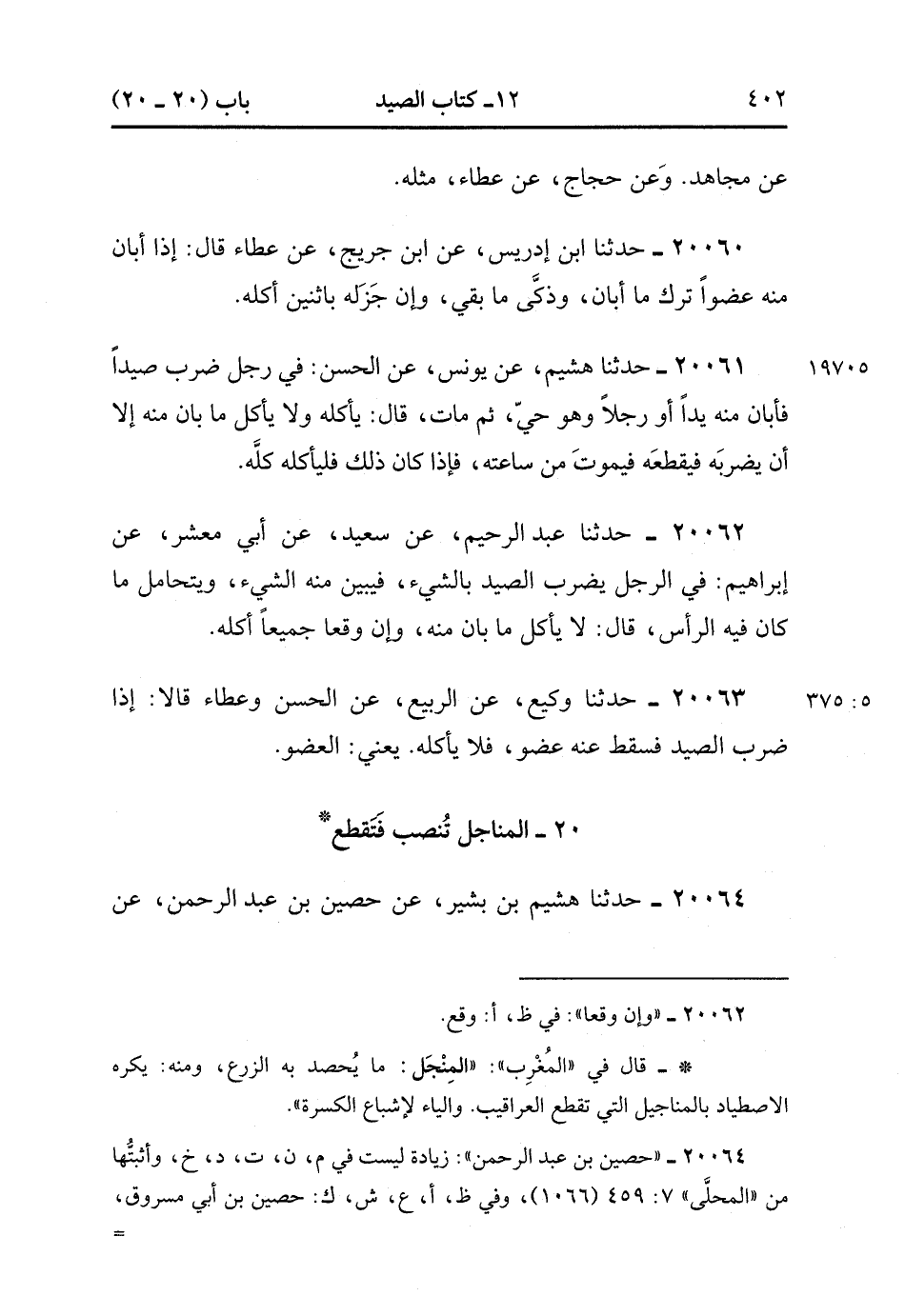 20064- حَدَّثَنَا هُشَيْمُ بْنُ بَشِيرٍ ، عَنْ حُصَيْنٍ بن عبد الرحمن ، عَنْ مَسْرُوق سُئِلَ عَنْ صَيْدِ الْمَنَاجِلِ ، قَالَ : إِنَّهَا تَقْطَعُ مِنَ الظِّبَاءِ وَالْحُمُرِ فَيَبِينُ مِنْهُ الشَّيءُ وَهُوَ حَيٌّ ، فَقَالَ ابْنُ عُمَرَ : مَا أَبَانَ مِنْهُ وَهُوَ حَيٌّ فَدَعْهُ وَكُلْ مَا سِوَى ذَلِكَ. (5/375).